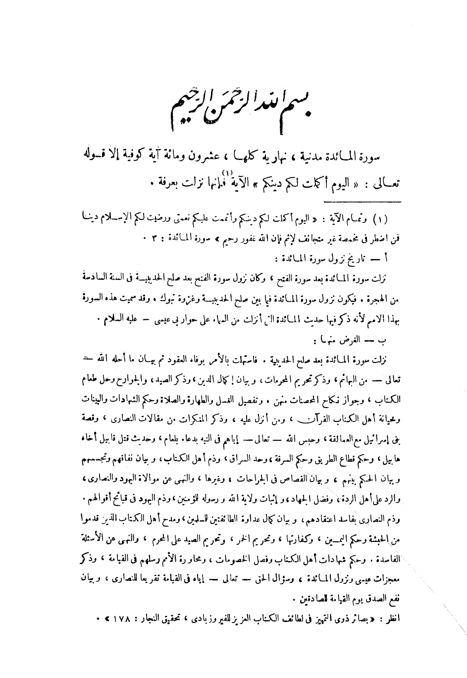 (1) وتمام الآية: الْيَوْمَ أَكْمَلْتُ لَكُمْ دِينَكُمْ وَأَتْمَمْتُ عَلَيْكُمْ نِعْمَتِي وَرَضِيتُ لَكُمُ الْإِسْلامَ دِيناً فَمَنِ اضْطُرَّ فِي مَخْمَصَةٍ غَيْرَ مُتَجانِفٍ لِإِثْمٍ فَإِنَّ اللَّهَ غَفُورٌ رَحِيمٌ سورة المائدة: 3.
