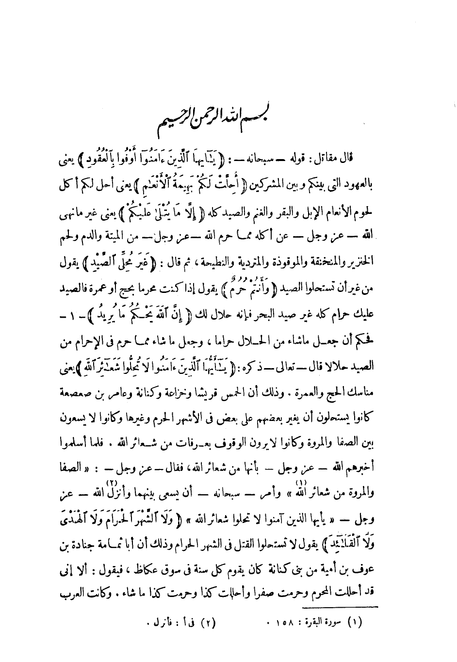بِسْمِ اللَّهِ الرَّحْمنِ الرَّحِيمِ قال مقاتل: قوله- سبحانه-: يا أَيُّهَا الَّذِينَ آمَنُوا أَوْفُوا بِالْعُقُودِ يعني بالعهود التي بينكم وبَيْنَ المشركين أُحِلَّتْ لَكُمْ بَهِيمَةُ الْأَنْعامِ يعني أحل لَكُمْ أكل لحوم الأنعام الإبل والبقر والغنم والصيد كله إِلَّا مَا يُتْلى عَلَيْكُمْ يعني غَيْر ما نهى اللَّه- عَزَّ وَجَلّ- عن أكله مما حرم اللَّه- عَزَّ وَجَلّ- من الميتة والدم ولحم الخنزير والمنخنقة والموقوذة والمتردية والنطيحة، ثُمّ قَالَ: غَيْرَ مُحِلِّي الصَّيْدِ يَقُولُ من غَيْر أن تستحلوا الصيد وَأَنْتُمْ حُرُمٌ يَقُولُ إذا كُنْت محرما بحج أو عُمْرَة فالصيد عليك حرام كله غَيْر صيد البحر فَإنَّهُ حلال لك إِنَّ اللَّهَ يَحْكُمُ ما يُرِيدُ- 1- فحكم أن جعل ما شاء من الحلال حراما، وَجَعَل ما شاء مما حرم فِي الإحرام من الصيد حلالا قال- تعالى- ذكره: يا أَيُّهَا الَّذِينَ آمَنُوا لا تُحِلُّوا شَعائِرَ اللَّهِ يعنى مناسك الحج والعمرة. وذلك أن الخمس قريشا وخزاعة وكنانة وعامر بن صَعْصَعَة كانوا يستحلون أن يغير بعضهم عَلَى بعض فِي الأشهر الحرم وغيرها وكانوا لا يسعون بين الصفا والمروة وكانوا لا يرون الوقوف بعرفات من شعائر اللَّه. فَلَمَّا أسلموا أخبرهم اللَّه- عَزَّ وَجَلّ- بأنها من شعائر اللَّه، فَقَالَ- عَزَّ وَجَلّ-: الصَّفا وَالْمَرْوَةَ مِنْ شَعائِرِ اللَّهِ «1» وأمر- سبحانه- أن يسعى بينهما وأنزل «2» الله- عز وجل- يا أَيُّهَا الَّذِينَ آمَنُوا لا تُحِلُّوا شَعائِرَ اللَّهِ وَلَا الشَّهْرَ الْحَرامَ وَلَا الْهَدْيَ وَلَا الْقَلائِدَ يَقُولُ لا تستحلوا القتل فِي الشهر الحرام وذلك أن أبا ثمامة جنادة بن عَوْف بن أميَّة من بني كنانة كان يقوم كُلّ سنة فِي سوق عكاظ، فيقول: ألا إني قَدْ أحللت المحرم وحرمت صفرا وأحللت كذا وحرمت كذا ما شاء. وكانت العرب