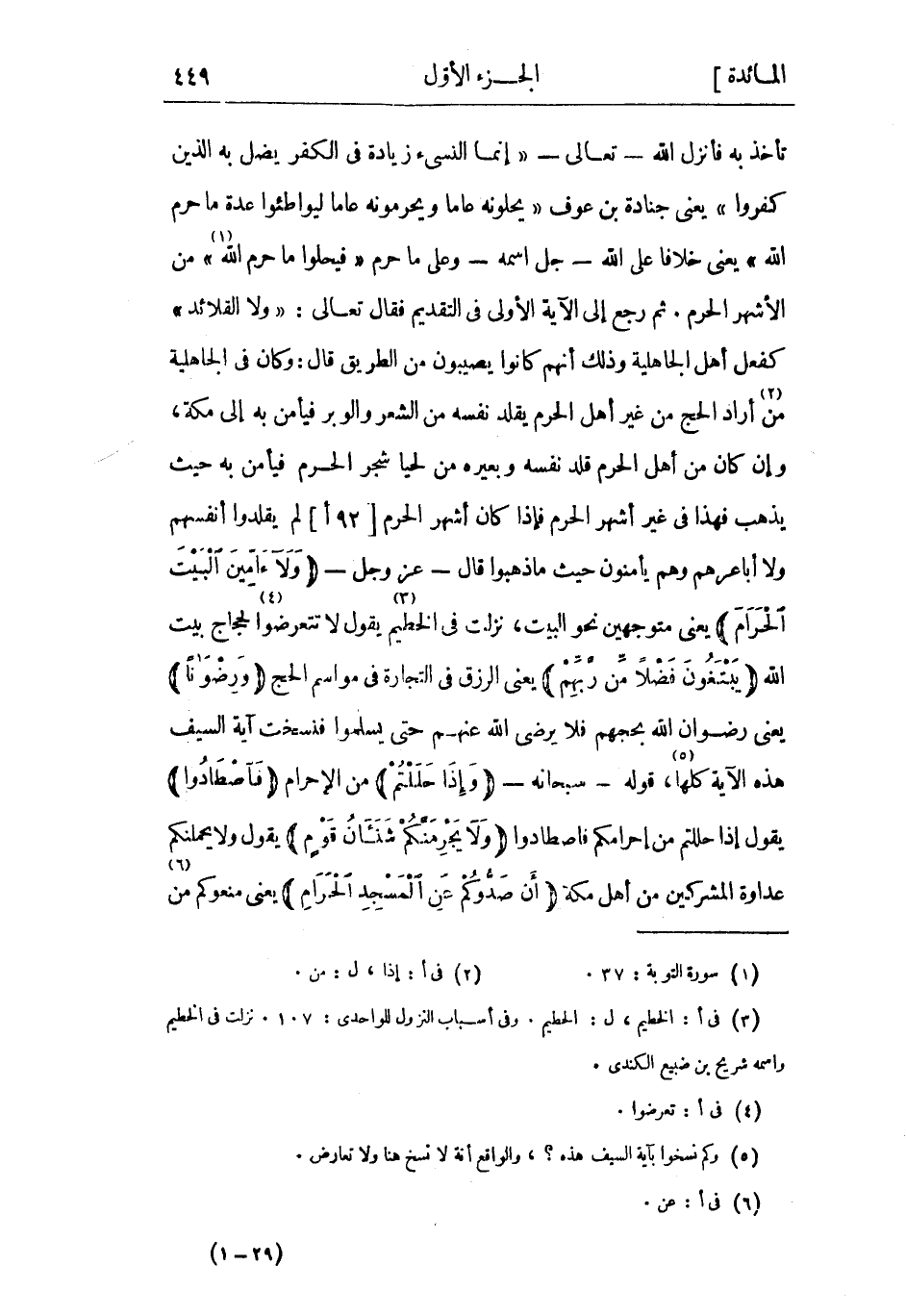 تأخذ به فأنزل اللَّه- تَعَالَى- «إِنَّمَا النَّسِيءُ زِيادَةٌ فِي الْكُفْرِ يُضَلُّ بِهِ الَّذِينَ كَفَرُوا» يعني جنادة بن عَوْف «يُحِلُّونَهُ عَامًا وَيُحَرِّمُونَهُ عاماً لِيُواطِؤُا عِدَّةَ ما حَرَّمَ اللَّهُ» يعني خلافا عَلَى اللَّه جلَّ اسمه- وعلى ما حرم فَيُحِلُّوا ما حَرَّمَ اللَّهُ «1» من الأشهر الحرم. ثُمّ رجع إلى الآية الأولى فِي التقديم فَقَالَ تَعَالَى: «وَلَا الْقَلائِدَ» كفعل أَهْل الْجَاهِلِيَّة وذلك أنهم كانوا يصيبون من الطريق قَالَ: وكان فِي الْجَاهِلِيَّة من «2» أراد الحج من غَيْر أَهْل الحرم يقلد نفسه من الشعر والوبر فيأمن به إلى مكة، وإن كان من أَهْل الحرم قلد نفسه وبعيره من لحيا شجر الحرم فيأمن به حيث يذهب فهذا فِي غَيْر أشهر الحرم فإذا كان أشهر الحرم [92 أ] لَمْ يقلدوا أنفسهم وَلا أباعرهم وهم يأمنون حيث ما ذهبوا قَالَ- عَزَّ وَجَلّ- وَلَا آمِّينَ الْبَيْتَ الْحَرامَ يعني متوجهين نحو البيت، نزلت فِي الخطيم «3» يَقُولُ لا تتعرضوا «4» لِحُجَّاج بيت اللَّه يَبْتَغُونَ فَضْلًا مِنْ رَبِّهِمْ يعني الرزق فِي التجارة فِي مواسم الحج وَرِضْواناً يعني رضوان اللَّه بحجهم فلا يرضى اللَّه عَنْهُمْ حَتَّى يسلموا فنسخت آية السيف هَذِهِ الآية كلها «5» ، قوله- سُبْحَانَهُ- وَإِذا حَلَلْتُمْ من الإحرام فَاصْطادُوا يَقُولُ إذا حللتم من إحرامكم فاصطادوا وَلا يَجْرِمَنَّكُمْ شَنَآنُ قَوْمٍ يَقُولُ وَلا يحملنكم عداوة المشركين من أَهْل مكة أَنْ صَدُّوكُمْ عَنِ الْمَسْجِدِ الْحَرامِ يعنى منعوكم من «6»