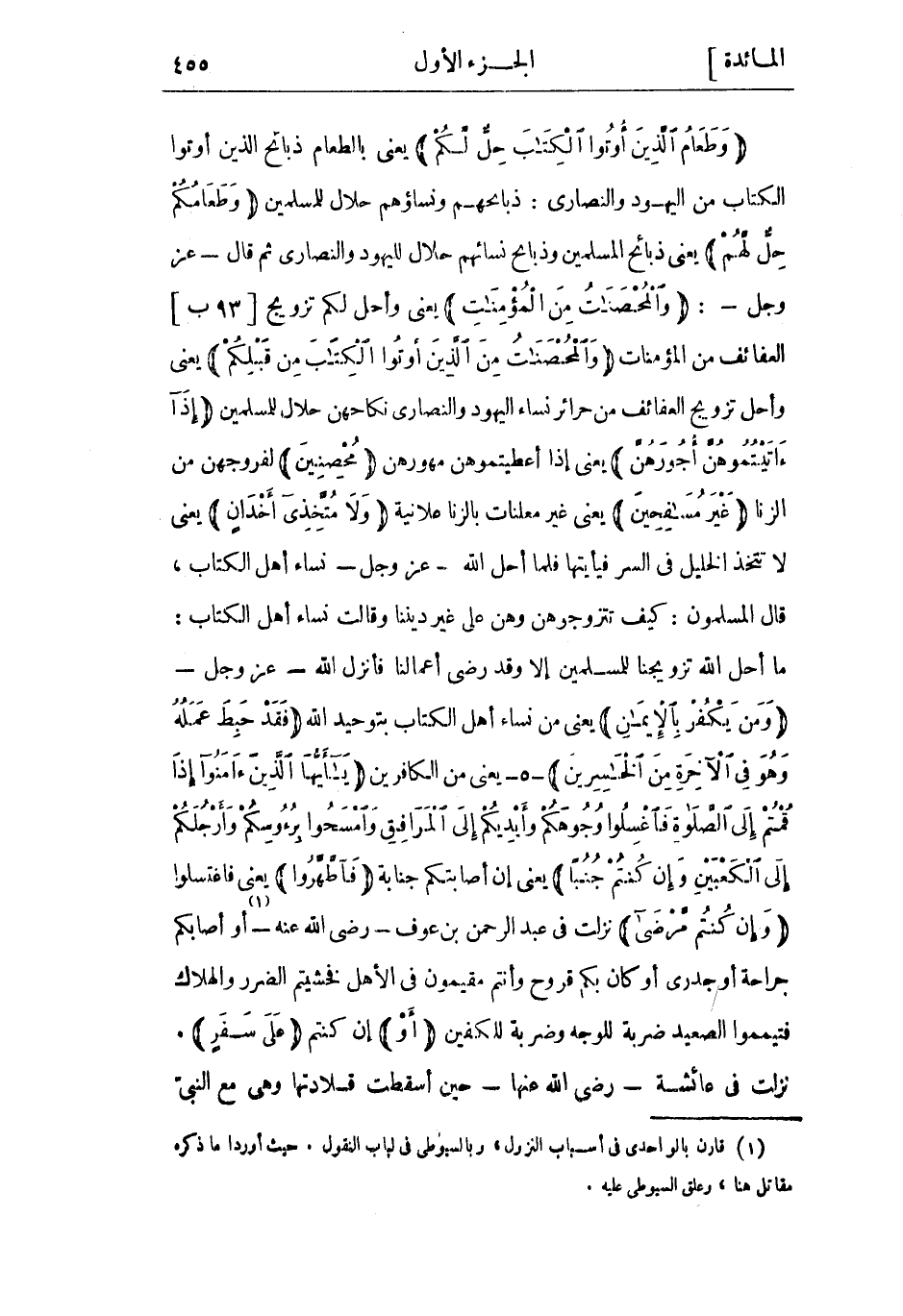 ما أحل اللَّه تزويجنا للمسلمين إِلَّا وَقَدْ رضي أعمالنا فأنزل اللَّه- عَزَّ وَجَلّ- وَمَنْ يَكْفُرْ بِالْإِيمانِ يعني من نساء أَهْل الكتاب بتوحيد اللَّه فَقَدْ حَبِطَ عَمَلُهُ وَهُوَ فِي الْآخِرَةِ مِنَ الْخاسِرِينَ- 5- يعنى من الكافرين يا أَيُّهَا الَّذِينَ آمَنُوا إِذا قُمْتُمْ إِلَى الصَّلاةِ فَاغْسِلُوا وُجُوهَكُمْ وَأَيْدِيَكُمْ إِلَى الْمَرافِقِ وَامْسَحُوا بِرُؤُسِكُمْ وَأَرْجُلَكُمْ إِلَى الْكَعْبَيْنِ وَإِنْ كُنْتُمْ جُنُباً يعني إن أصابتكم جنابة فَاطَّهَّرُوا يعني فاغتسلوا وَإِنْ كُنْتُمْ مَرْضى نزلت فِي عَبْد الرَّحْمَن بن عَوْف- رَضِيَ اللَّه عَنْهُ- «1» أَوْ أصابكم جراحة أَوْ جدري أو كان بكم قروح وأنتم مقيمون فِي الأهل فخشيتم الضرر والهلاك فتيمموا الصعيد ضربة للوجه وضربة للكفين أَوْ إن كنتم عَلى سَفَرٍ.