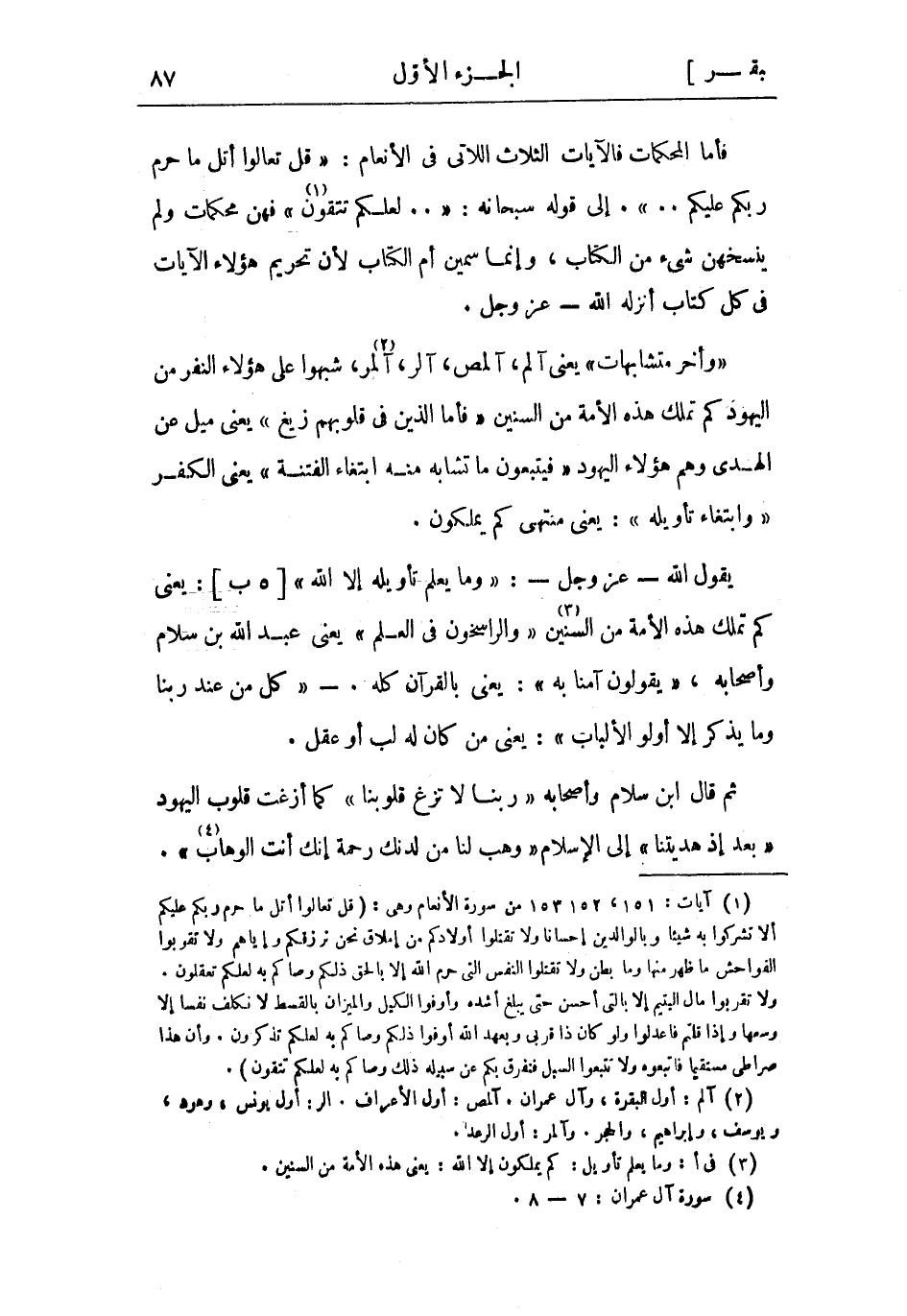 فأما المحكمات فالآيات الثلاث اللاتي فِي الأنعام: قُلْ تَعالَوْا أَتْلُ مَا حَرَّمَ رَبُّكُمْ عَلَيْكُمْ.... إلى قوله سبحانه: ... لَعَلَّكُمْ تَعْقِلُونَ «1» فهن محكمات وَلَم ينسخهن شيء من الكتاب، وإنما سمين أم الكتاب لأن تحريم هَؤُلاءِ الآيات فِي كُلّ كتاب أنزله اللَّه- عَزَّ وَجَلّ.