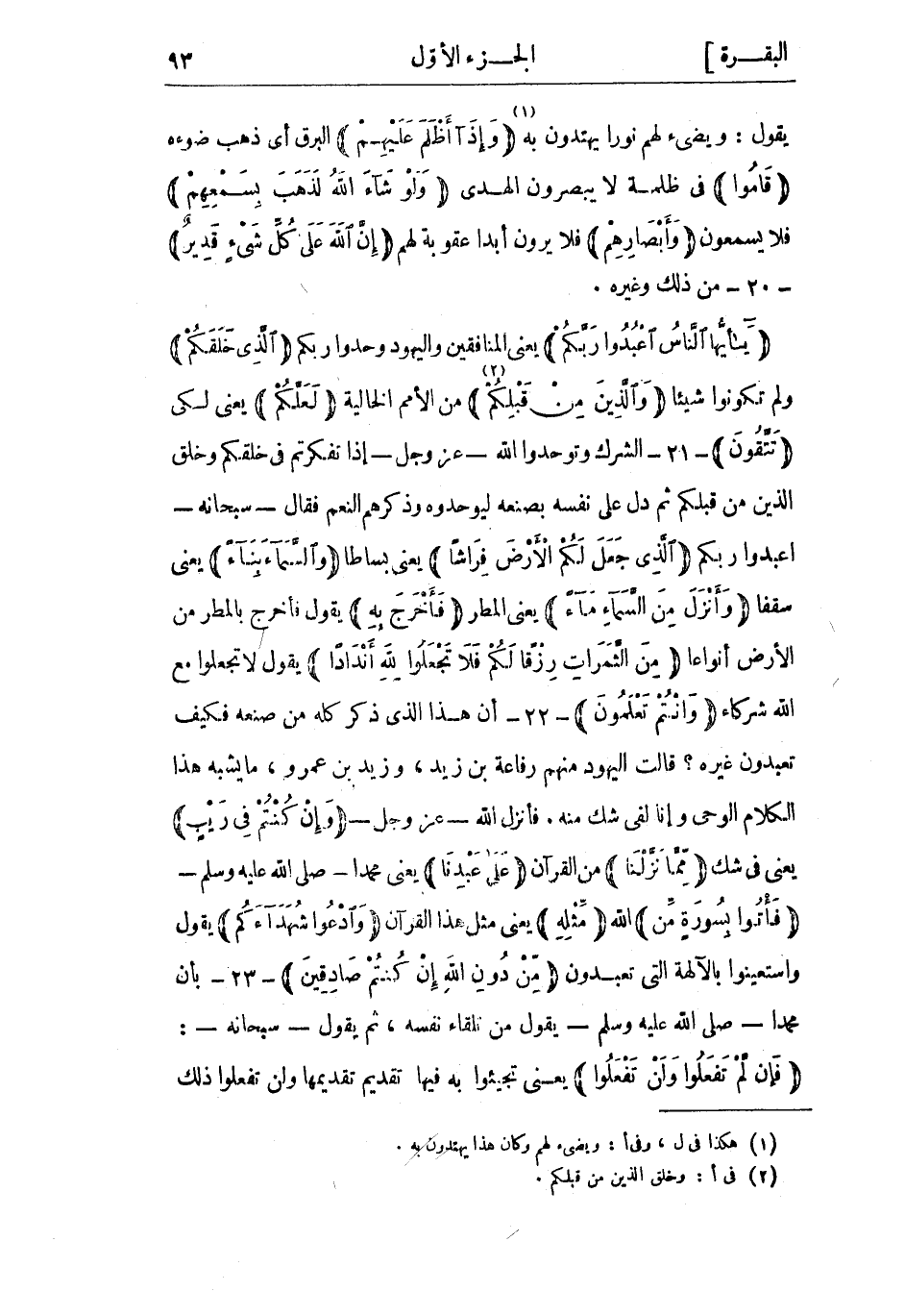 يا أَيُّهَا النَّاسُ اعْبُدُوا رَبَّكُمُ يعني المنافقين واليهود وحدوا ربكم الَّذِي خَلَقَكُمْ ولم تكونوا شيئا وَالَّذِينَ مِنْ قَبْلِكُمْ «2» من الأمم الخالية لَعَلَّكُمْ يعني لكي تَتَّقُونَ- 21- الشرك وتوحدوا اللَّه- عَزَّ وَجَلّ- إذا تفكرتم فِي خلقكم وخلق الَّذِين من قبلكم ثُمّ دل عَلَى نفسه بصنعه ليوحدوه وذكرهم النعم فَقَالَ- سُبْحَانَهُ- اعبدوا ربكم الَّذِي جَعَلَ لَكُمُ الْأَرْضَ فِراشاً يعني بساطا وَالسَّماءَ بِناءً يعني سقفا وَأَنْزَلَ مِنَ السَّماءِ ماءً يعني المطر فَأَخْرَجَ بِهِ يَقُولُ فأخرج بالمطر من الأرض أنواعا مِنَ الثَّمَراتِ رِزْقاً لَكُمْ فَلا تَجْعَلُوا لِلَّهِ أَنْداداً يَقُولُ لا تجعلوا مَعَ اللَّه شركاء وَأَنْتُمْ تَعْلَمُونَ- 22- أن هَذَا الَّذِي ذكر كله من صنعه فكيف تعبدون غيره؟ قَالَت اليهود منهم رِفَاعة بن زَيْد، وزيد بن عمرو، ما يشبه هَذَا الكلام الوحي وإنا لفي شك منه. فأنزل اللَّه- عَزَّ وجل- وَإِنْ كُنْتُمْ فِي رَيْبٍ يعني فِي شك مِمَّا نَزَّلْنا من القرآن عَلى عَبْدِنا يعني محمدا- صَلَّى اللَّهُ عَلَيْهِ وسلم- فَأْتُوا بِسُورَةٍ مِنْ اللَّه مِثْلِهِ يعني مثل هذا القرآن وَادْعُوا شُهَداءَكُمْ يَقُولُ واستعينوا بالآلهة التي تعبدون مِنْ دُونِ اللَّهِ إِنْ كُنْتُمْ صادِقِينَ 23- بأن محمدا- صَلَّى اللَّهُ عَلَيْهِ وَسَلَّمَ- يَقُولُ من تلقاء نفسه، ثُمّ يَقُولُ- سُبْحَانَهُ-: