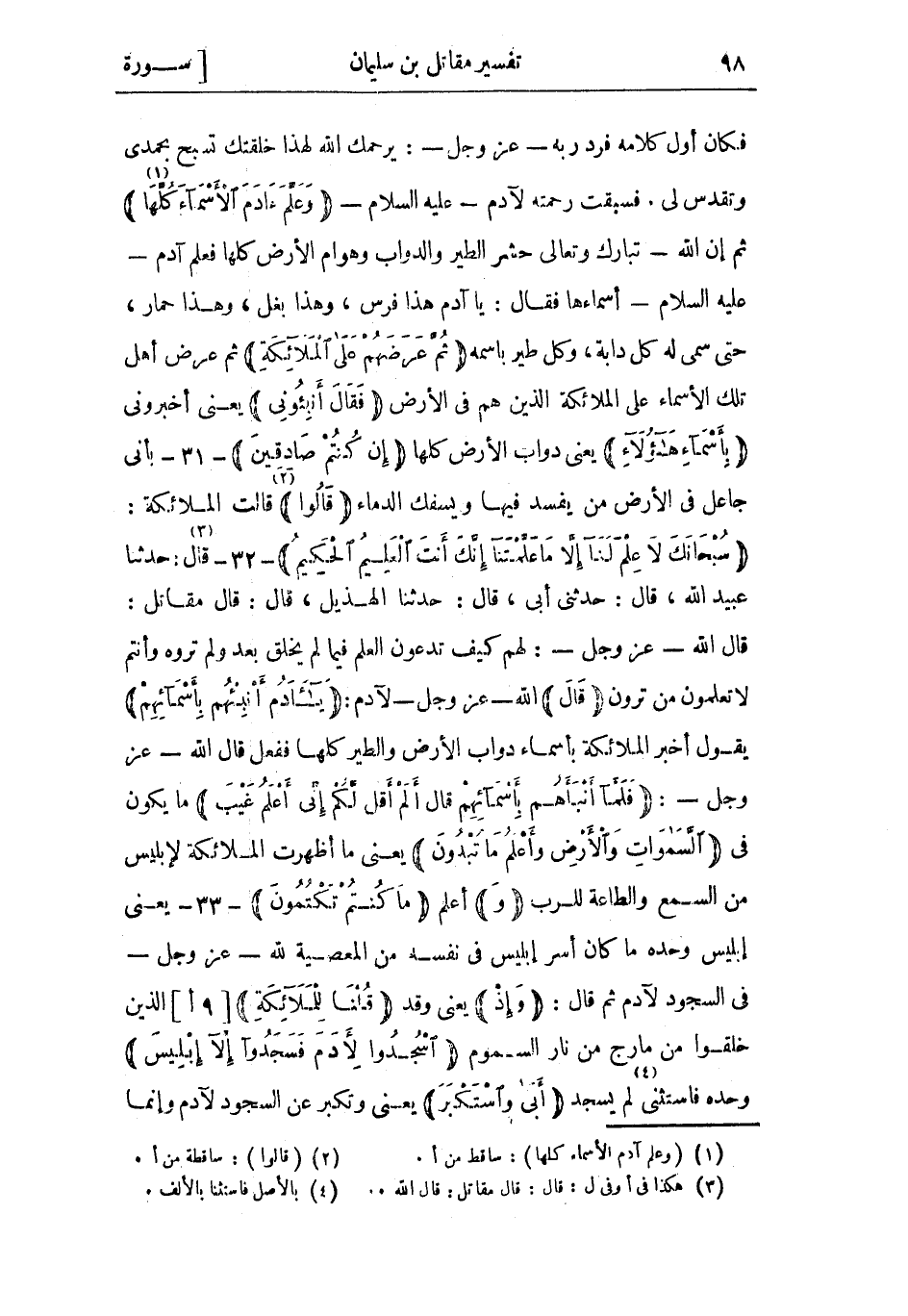 قال اللَّه- عَزَّ وَجَلّ-: لهم كيف تدعون العلم فيما لَمْ يخلق بعد وَلَم تروه وأنتم لا تعلمون من ترون قالَ اللَّه- عَزَّ وَجَلّ- لآدم: يَا آدَمُ أَنْبِئْهُمْ بِأَسْمائِهِمْ يَقُولُ أخبر الملائكة بأسماء دواب الأرض والطير كلها ففعل قَالَ اللَّه- عَزَّ وَجَلّ-: فَلَمَّا أَنْبَأَهُمْ بِأَسْمائِهِمْ قالَ أَلَمْ أَقُلْ لَكُمْ إِنِّي أَعْلَمُ غَيْبَ ما يكون فى السَّماواتِ وَالْأَرْضِ وَأَعْلَمُ ما تُبْدُونَ يعني ما أظهرت الملائكة لإبليس من السمع والطاعة للرب وَأعلم ما كُنْتُمْ تَكْتُمُونَ- 33- يعني إبليس وحده ما كان أسر إبليس فِي نفسه من المعصية للَّه- عَزَّ وَجَلّ- فى السجود لآدم ثُمّ قَالَ: وَإِذْ يعني وَقَدْ قُلْنا لِلْمَلائِكَةِ [9 أ] الَّذِين خلقوا من مارج من نار السموم اسْجُدُوا لِآدَمَ فَسَجَدُوا إِلَّا إِبْلِيسَ وحده فاستثنى «4» لَمْ يسجد أَبى وَاسْتَكْبَرَ يعني وتكبر عن السجود لآدم وإنما