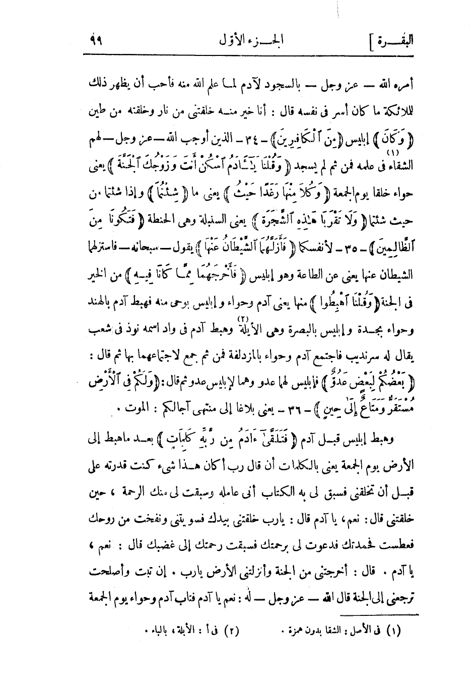 أمره اللَّه- عَزَّ وَجَلّ- بالسجود لآدم لما علم اللَّه منه فأحب أن يظهر ذَلِكَ للملائكة ما كان أسر فى نفسه قالَ: أَنَا خَيْرٌ مِنْهُ خَلَقْتَنِي مِنْ نارٍ وَخَلَقْتَهُ مِنْ طِينٍ وَكانَ إبليس مِنَ الْكافِرِينَ- 34- الَّذِين أوجب اللَّه- عَزَّ وَجَلّ- لَهُم الشقاء «1» فِي علمه فَمنْ ثُمّ لَمْ يسجد وَقُلْنا يَا آدَمُ اسْكُنْ أَنْتَ وَزَوْجُكَ الْجَنَّةَ يعني حواء خلقا يوم الجمعة وَكُلا مِنْها رَغَداً حَيْثُ يعني ما شِئْتُما وإذا شئتما من حيث شئتما وَلا تَقْرَبا هذِهِ الشَّجَرَةَ يعني السنبلة وهي الحنطة فَتَكُونا مِنَ الظَّالِمِينَ- 35- لأنفسكما فَأَزَلَّهُمَا الشَّيْطانُ عَنْها يقول- سبحانه- فاستزلهما الشيطان عنها يعني عن الطاعة وَهُوَ إبليس فَأَخْرَجَهُما مِمَّا كانا فِيهِ من الخير في الجنة وَقُلْنَا اهْبِطُوا منها يعني آدم وحواء وإبليس بوحي منه فهبط آدم بالهند وحواء بجدة وإبليس بالبصرة وهي الأيلة «2» وهبط آدم فِي واد اسمه نوذ في شعب يقال له سرنديب فاجتمع آدم وحواء بالمزدلفة فمن ثم جمع لاجتماعهما بها ثم قال: