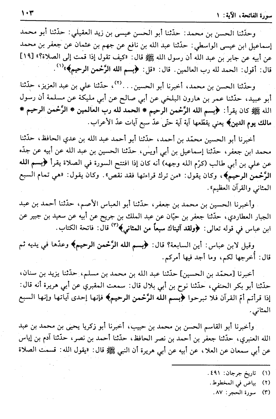 أخبرنا أبو الحسن محمّد بن أحمد، حدّثنا أبو أحمد عبد الله بن عدي الحافظ، حدّثنا محمد ابن جعفر، حدّثنا إسماعيل بن أبي أويس، حدّثنا الحسين بن عبد الله عن أبيه عن جدّه عن علي بن أبي طالب (كرّم الله وجهه) أنه كان إذا افتتح السورة في الصلاة يقرأ بِسْمِ اللَّهِ الرَّحْمنِ الرَّحِيمِ، وكان يقول: «من ترك قراءتها فقد نقص» . وكان يقول: «هي تمام السبع المثاني والقرآن العظيم» .