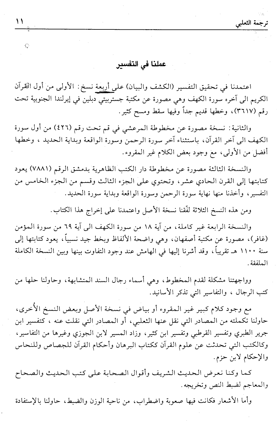مع وجود كلام كبير غير المقروء أو بياض في نسخة الأصل وبعض النسخ الأخرى، حاولنا تكملته من المصادر التي نقل عنها الثعلبي، أو المصادر التي نقلت عنه، كتفسير ابن جرير الطبري وتفسير القرطبي وتفسير ابن كثير، وزاد المسير لابن الجوزي وغيرها من التفاسير، وكالكتب التي تحدثت عن علوم القرآن ككتاب البرهان وأحكام القرآن للجصاص وللنحاس والإحكام لابن حزم.