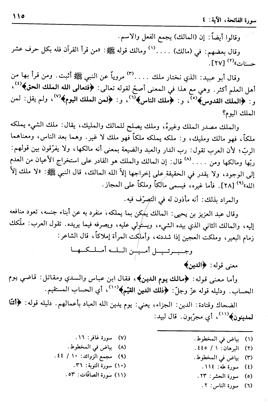 معنى قوله: الدِّينِ وأما معنى قوله: مالِكِ يَوْمِ الدِّينِ، فقال ابن عباس والسدي ومقاتل: قاضي يوم الحساب. ودليله قوله عزّ وجلّ: ذلِكَ الدِّينُ الْقَيِّمُ «10» ، أي الحساب المستقيم.
