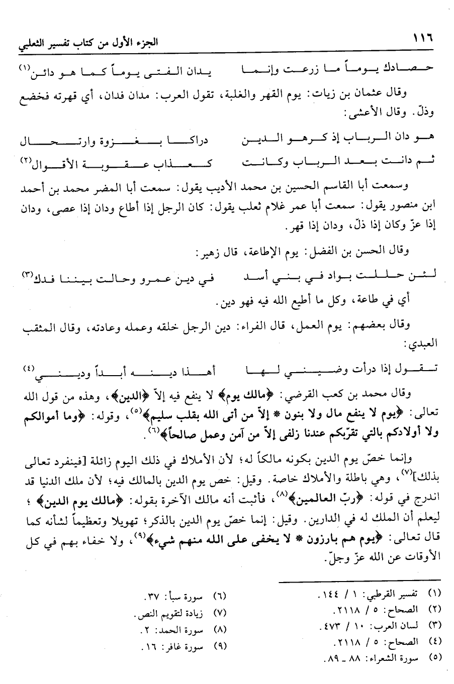 وقال محمد بن كعب القرضي: مالك يوم لا ينفع فيه إلّا الدين، وهذه من قول الله تعالى: يَوْمَ لا يَنْفَعُ مالٌ وَلا بَنُونَ إِلَّا مَنْ أَتَى اللَّهَ بِقَلْبٍ سَلِيمٍ «5» ، وقوله: وَما أَمْوالُكُمْ وَلا أَوْلادُكُمْ بِالَّتِي تُقَرِّبُكُمْ عِنْدَنا زُلْفى إِلَّا مَنْ آمَنَ وَعَمِلَ صالِحاً «6» .