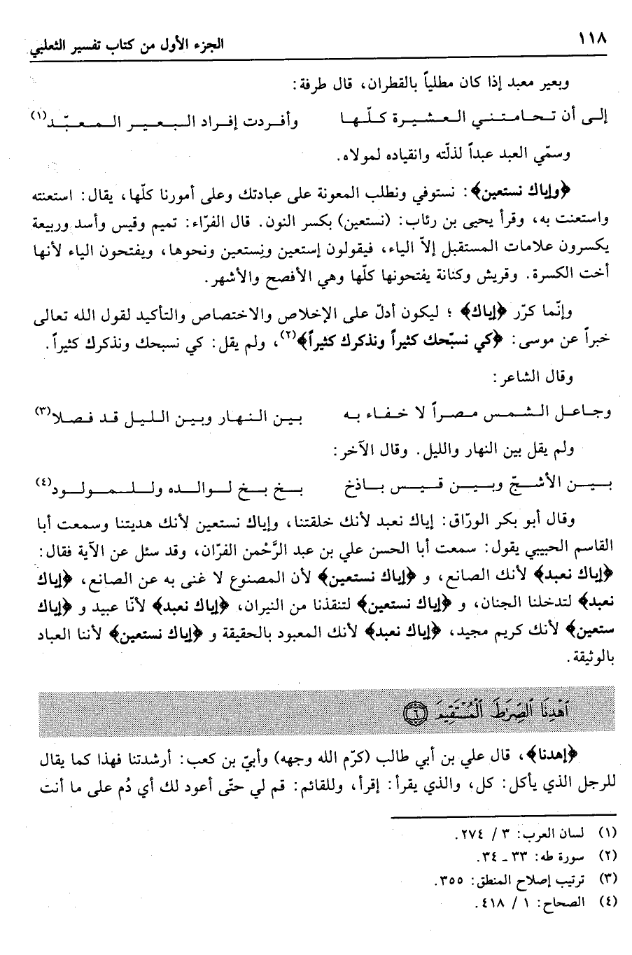 إِيَّاكَ نَعْبُدُ لأنك الصانع، وإِيَّاكَ نَسْتَعِينُ لأن المصنوع لا غنى به عن الصانع، إِيَّاكَ نَعْبُدُ لتدخلنا الجنان، وإِيَّاكَ نَسْتَعِينُ لتنقذنا من النيران، إِيَّاكَ نَعْبُدُ لأنّا عبيد وإِيَّاكَ نَسْتَعِينُ لأنك كريم مجيد، إِيَّاكَ نَعْبُدُ لأنك المعبود بالحقيقة وإِيَّاكَ نَسْتَعِينُ لأننا العباد بالوثيقة.