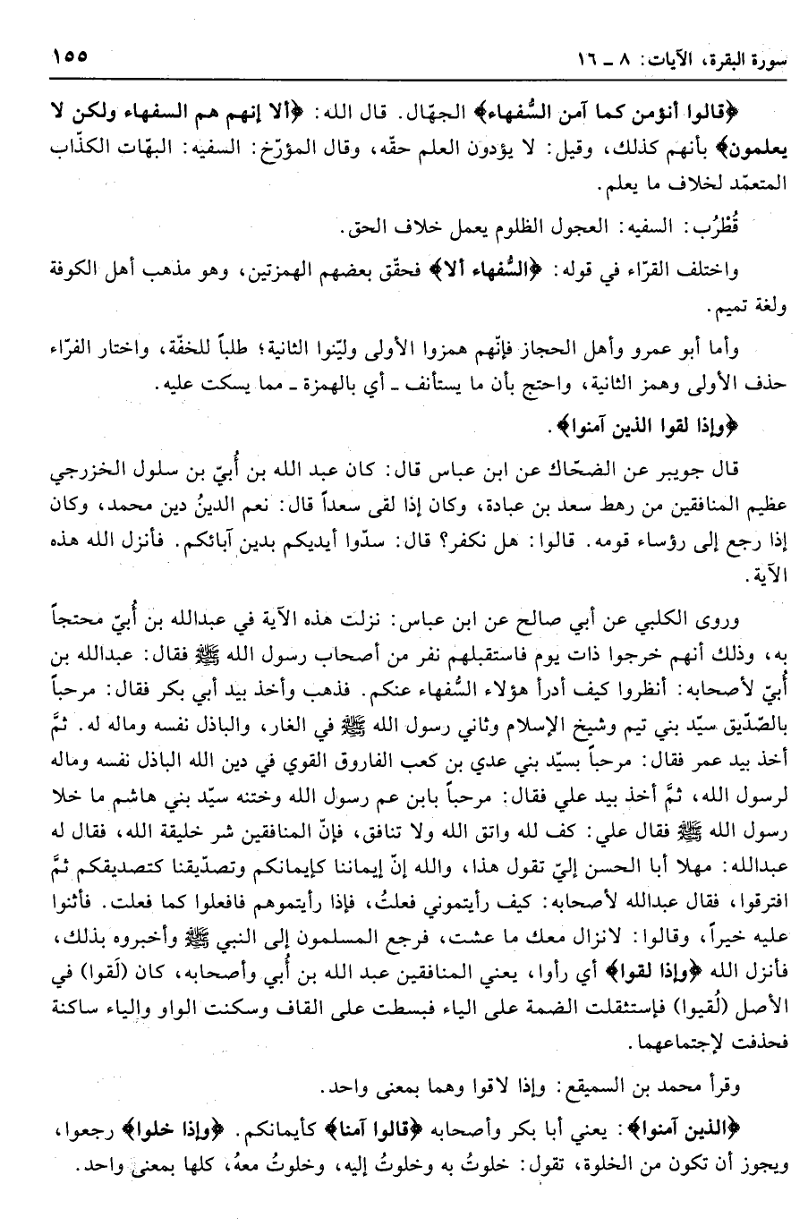 وروى الكلبي عن أبي صالح عن ابن عباس: نزلت هذه الآية في عبد الله بن أبيّ محتجا به، وذلك أنهم خرجوا ذات يوم فاستقبلهم نفر من أصحاب رسول الله صلّى الله عليه وسلّم فقال: عبد الله بن أبيّ لأصحابه: أنظروا كيف أدرأ هؤلاء السّفهاء عنكم. فذهب وأخذ بيد أبي بكر فقال: مرحبا بالصّدّيق سيّد بني تيم وشيخ الإسلام وثاني رسول الله صلّى الله عليه وسلّم في الغار، والباذل نفسه وماله له. ثمّ أخذ بيد عمر فقال: مرحبا بسيّد بني عدي بن كعب الفاروق القوي في دين الله الباذل نفسه وماله لرسول الله، ثمّ أخذ بيد علي فقال: مرحبا بابن عم رسول الله وختنه سيّد بني هاشم ما خلا رسول الله صلّى الله عليه وسلّم فقال علي: كف لله واتق الله ولا تنافق، فإنّ المنافقين شر خليقة الله، فقال له عبد الله: مهلا أبا الحسن إليّ تقول هذا، والله إنّ إيماننا كإيمانكم وتصدّيقنا كتصديقكم ثمّ افترقوا، فقال عبد الله لأصحابه: كيف رأيتموني فعلت، فإذا رأيتموهم فافعلوا كما فعلت. فأثنوا عليه خيرا، وقالوا: لا نزال معك ما عشت، فرجع المسلمون إلى النبي صلّى الله عليه وسلّم وأخبروه بذلك، فأنزل الله وَإِذا لَقُوا أي رأوا، يعني المنافقين عبد الله بن أبي وأصحابه