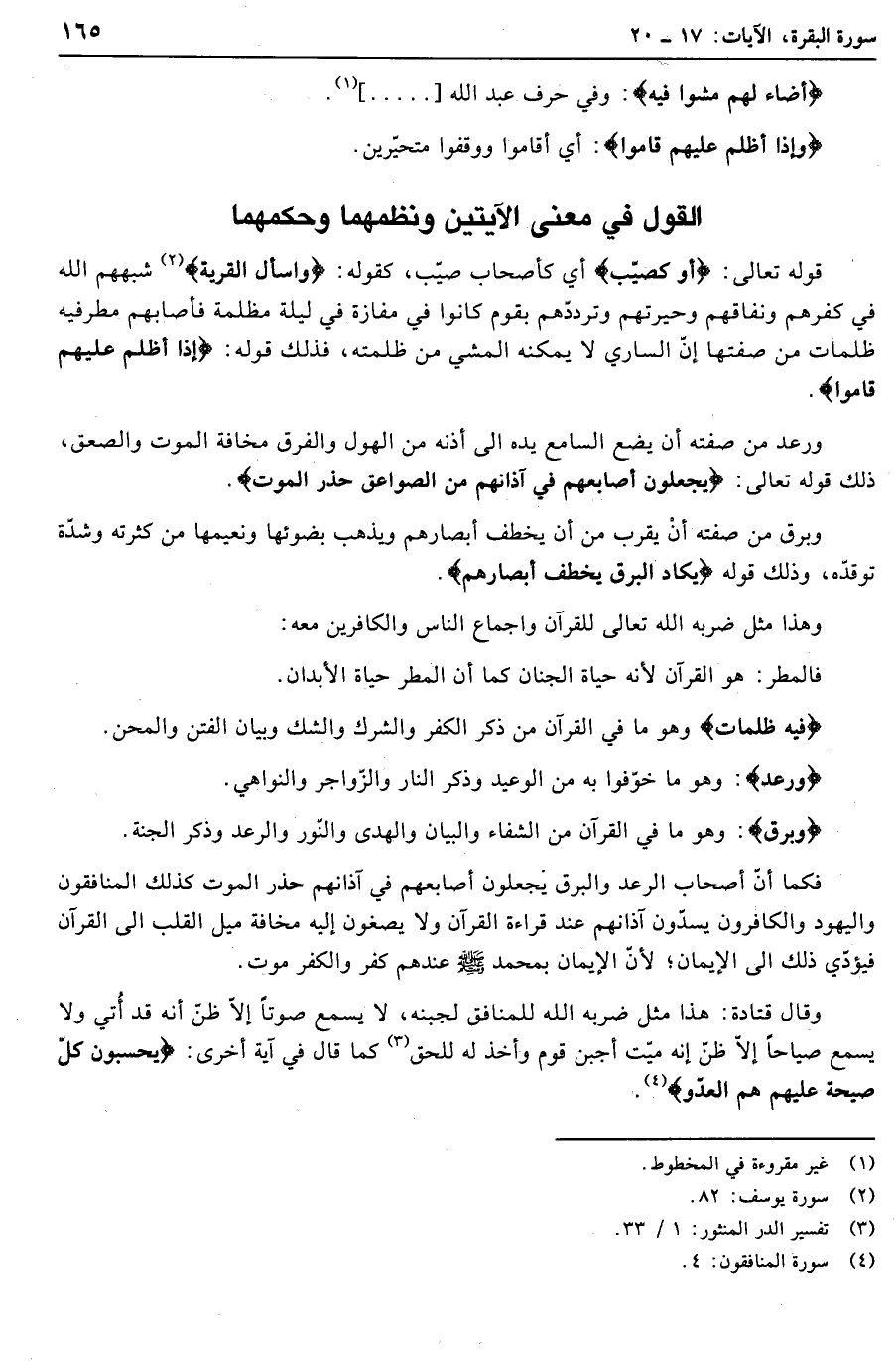 قوله تعالى: أَوْ كَصَيِّبٍ أي كأصحاب صيّب، كقوله: وَسْئَلِ الْقَرْيَةَ «2» شبههم الله في كفرهم ونفاقهم وحيرتهم وتردّدهم بقوم كانوا في مفازة في ليلة مظلمة فأصابهم مطر فيه ظلمات من صفتها إنّ الساري لا يمكنه المشي من ظلمته، فذلك قوله: إِذا أَظْلَمَ عَلَيْهِمْ قامُوا.
