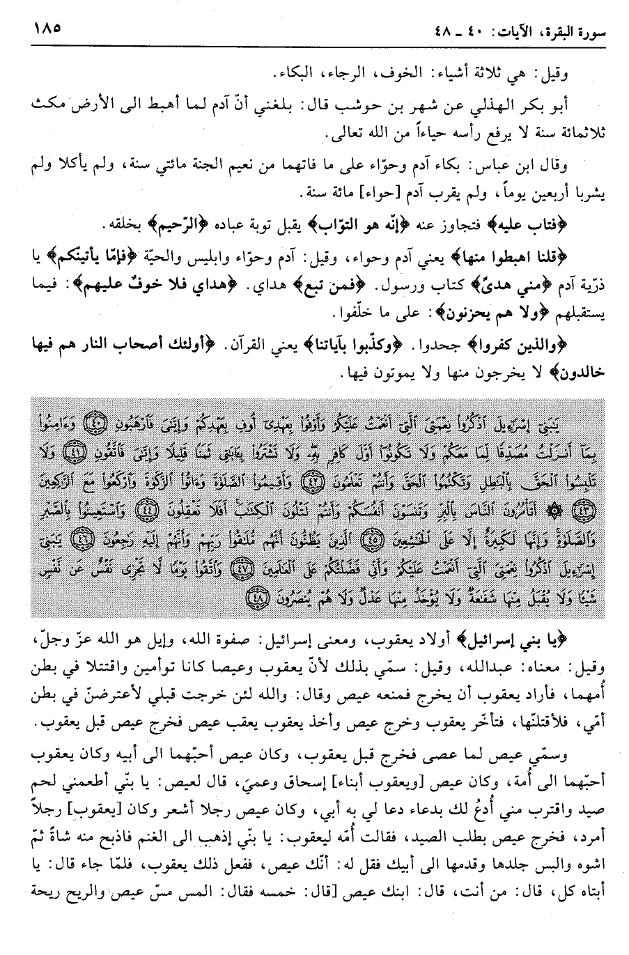 يا بَنِي إِسْرائِيلَ اذْكُرُوا نِعْمَتِيَ الَّتِي أَنْعَمْتُ عَلَيْكُمْ وَأَوْفُوا بِعَهْدِي أُوفِ بِعَهْدِكُمْ وَإِيَّايَ فَارْهَبُونِ (40) وَآمِنُوا بِما أَنْزَلْتُ مُصَدِّقاً لِما مَعَكُمْ وَلا تَكُونُوا أَوَّلَ كافِرٍ بِهِ وَلا تَشْتَرُوا بِآياتِي ثَمَناً قَلِيلاً وَإِيَّايَ فَاتَّقُونِ (41) وَلا تَلْبِسُوا الْحَقَّ بِالْباطِلِ وَتَكْتُمُوا الْحَقَّ وَأَنْتُمْ تَعْلَمُونَ (42) وَأَقِيمُوا الصَّلاةَ وَآتُوا الزَّكاةَ وَارْكَعُوا مَعَ الرَّاكِعِينَ (43) أَتَأْمُرُونَ النَّاسَ بِالْبِرِّ وَتَنْسَوْنَ أَنْفُسَكُمْ وَأَنْتُمْ تَتْلُونَ الْكِتابَ أَفَلا تَعْقِلُونَ (44)