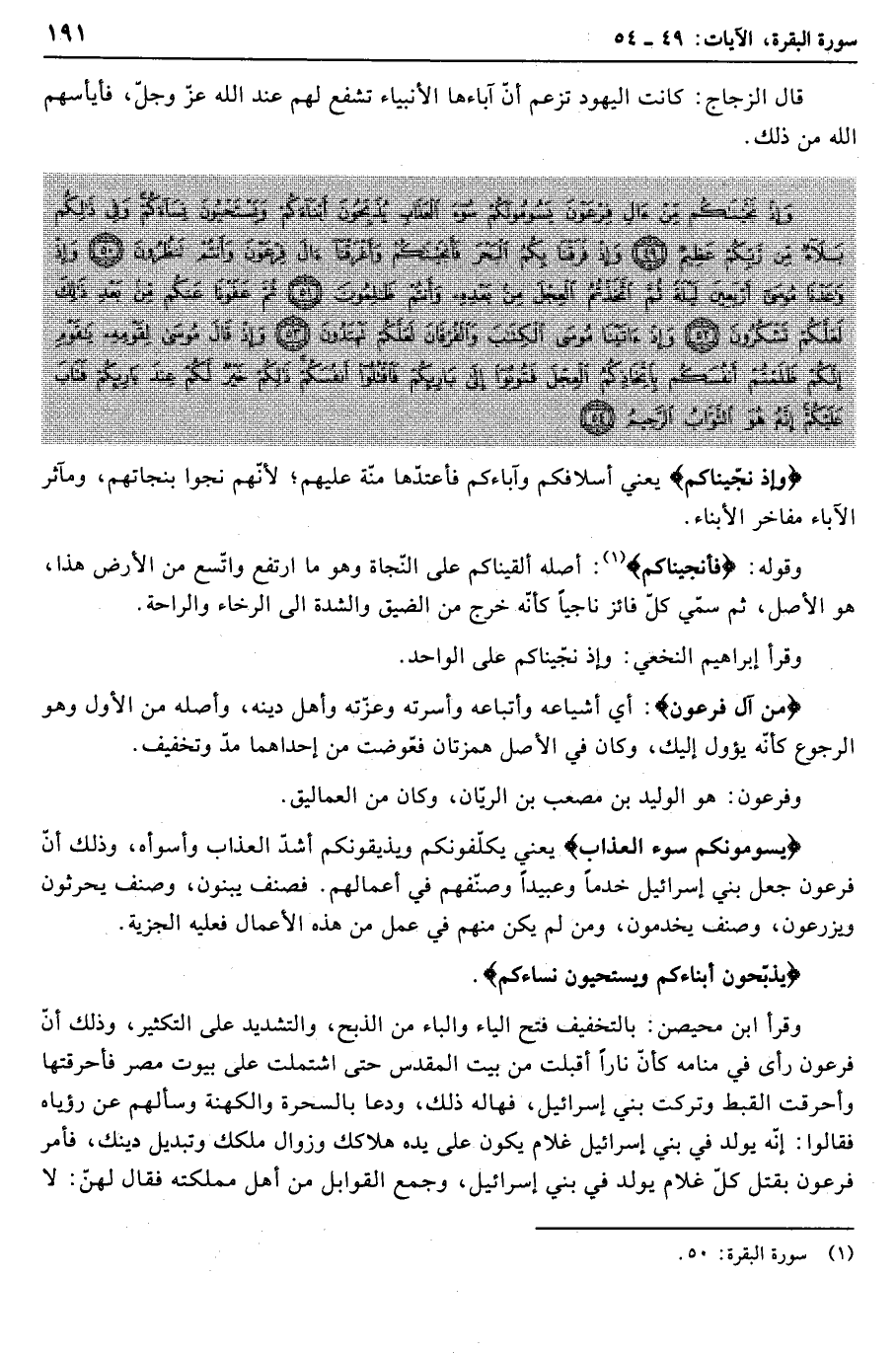 وَإِذْ نَجَّيْناكُمْ مِنْ آلِ فِرْعَوْنَ يَسُومُونَكُمْ سُوءَ الْعَذابِ يُذَبِّحُونَ أَبْناءَكُمْ وَيَسْتَحْيُونَ نِساءَكُمْ وَفِي ذلِكُمْ بَلاءٌ مِنْ رَبِّكُمْ عَظِيمٌ (49) وَإِذْ فَرَقْنا بِكُمُ الْبَحْرَ فَأَنْجَيْناكُمْ وَأَغْرَقْنا آلَ فِرْعَوْنَ وَأَنْتُمْ تَنْظُرُونَ (50) وَإِذْ واعَدْنا مُوسى أَرْبَعِينَ لَيْلَةً ثُمَّ اتَّخَذْتُمُ الْعِجْلَ مِنْ بَعْدِهِ وَأَنْتُمْ ظالِمُونَ (51) ثُمَّ عَفَوْنا عَنْكُمْ مِنْ بَعْدِ ذلِكَ لَعَلَّكُمْ تَشْكُرُونَ (52) وَإِذْ آتَيْنا مُوسَى الْكِتابَ وَالْفُرْقانَ لَعَلَّكُمْ تَهْتَدُونَ (53)
