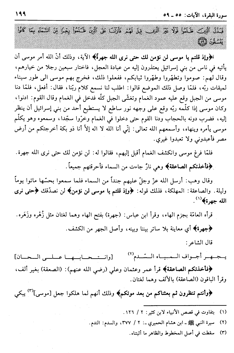 وَإِذْ قُلْتُمْ يا مُوسى لَنْ نُؤْمِنَ لَكَ حَتَّى نَرَى اللَّهَ جَهْرَةً الآية، وذلك أنّ الله أمر موسى أن يأتيه في ناس من بني إسرائيل يعتذرون إليه من عبادة العجل، فاختار سبعين رجلا من خيارهم، وقال لهم: صوموا وتطهّروا وطهّروا ثيابكم، ففعلوا ذلك، فخرج بهم موسى الى طور سيناء لميقات ربّه، فلمّا وصل ذلك الموضع قالوا: اطلب لنا نسمع كلام ربّنا، فقال: أفعل، فلمّا دنا موسى من الجبل وقع عليه عمود الغمام وتغشّى الجبل كلّه فدخل في الغمام وقال القوم: ادنوا، وكان موسى إذا كلّمه ربّه وقع على وجهه نور ساطع لا يستطيع أحد من بني إسرائيل أن ينظر إليه، فضرب دونه بالحجاب ودنا القوم حتى دخلوا في الغمام وخرّوا سجّدا، وسمعوه وهو يكلّم موسى يأمره وينهاه، وأسمعهم الله تعالى: إنّي أنا الله لا اله إلّا أنا ذو بكة أخرجتكم من أرض مصر فاعبدوني ولا تعبدوا غيري.