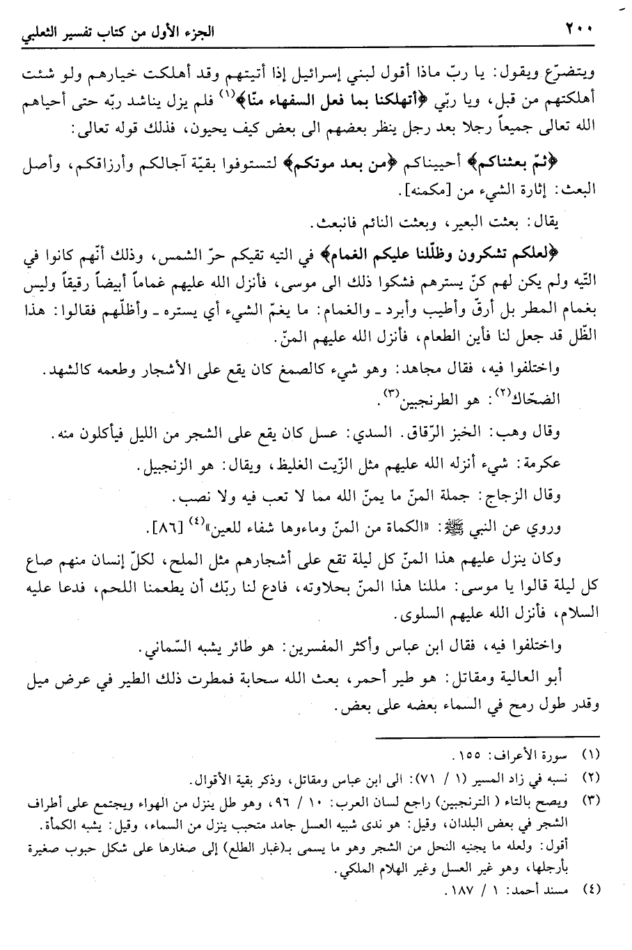 وكان ينزل عليهم هذا المنّ كل ليلة تقع على أشجارهم مثل الملح، لكلّ إنسان منهم صاع كل ليلة قالوا يا موسى: مللنا هذا المنّ بحلاوته، فادع لنا ربّك أن يطعمنا اللحم، فدعا عليه السلام، فأنزل الله عليهم السلوى.