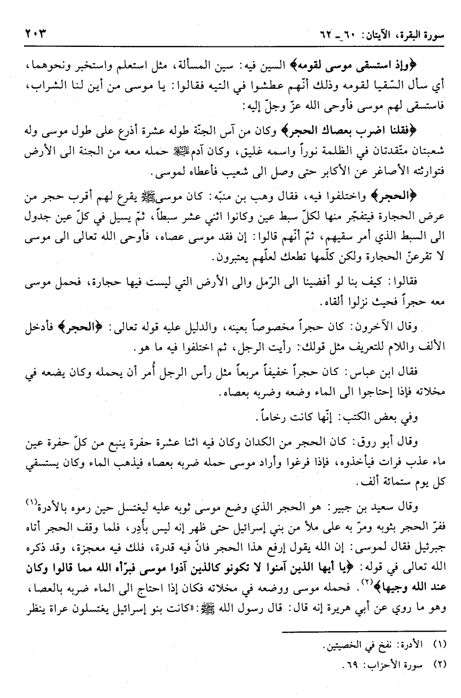 وقال سعيد بن جبير: هو الحجر الذي وضع موسى ثوبه عليه ليغتسل حين رموه بالأدرة «1» ففرّ الحجر بثوبه ومرّ به على ملأ من بني إسرائيل حتى ظهر إنه ليس بآدر، فلما وقف الحجر أتاه جبرئيل فقال لموسى: إن الله يقول ارفع هذا الحجر فانّ فيه قدرة، فلك فيه معجزة، وقد ذكره الله تعالى في قوله: يا أَيُّهَا الَّذِينَ آمَنُوا لا تَكُونُوا كَالَّذِينَ آذَوْا مُوسى فَبَرَّأَهُ اللَّهُ مِمَّا قالُوا وَكانَ عِنْدَ اللَّهِ وَجِيهاً «2» . فحمله موسى ووضعه في مخلاته فكان إذا احتاج الى الماء ضربه بالعصا، وهو ما