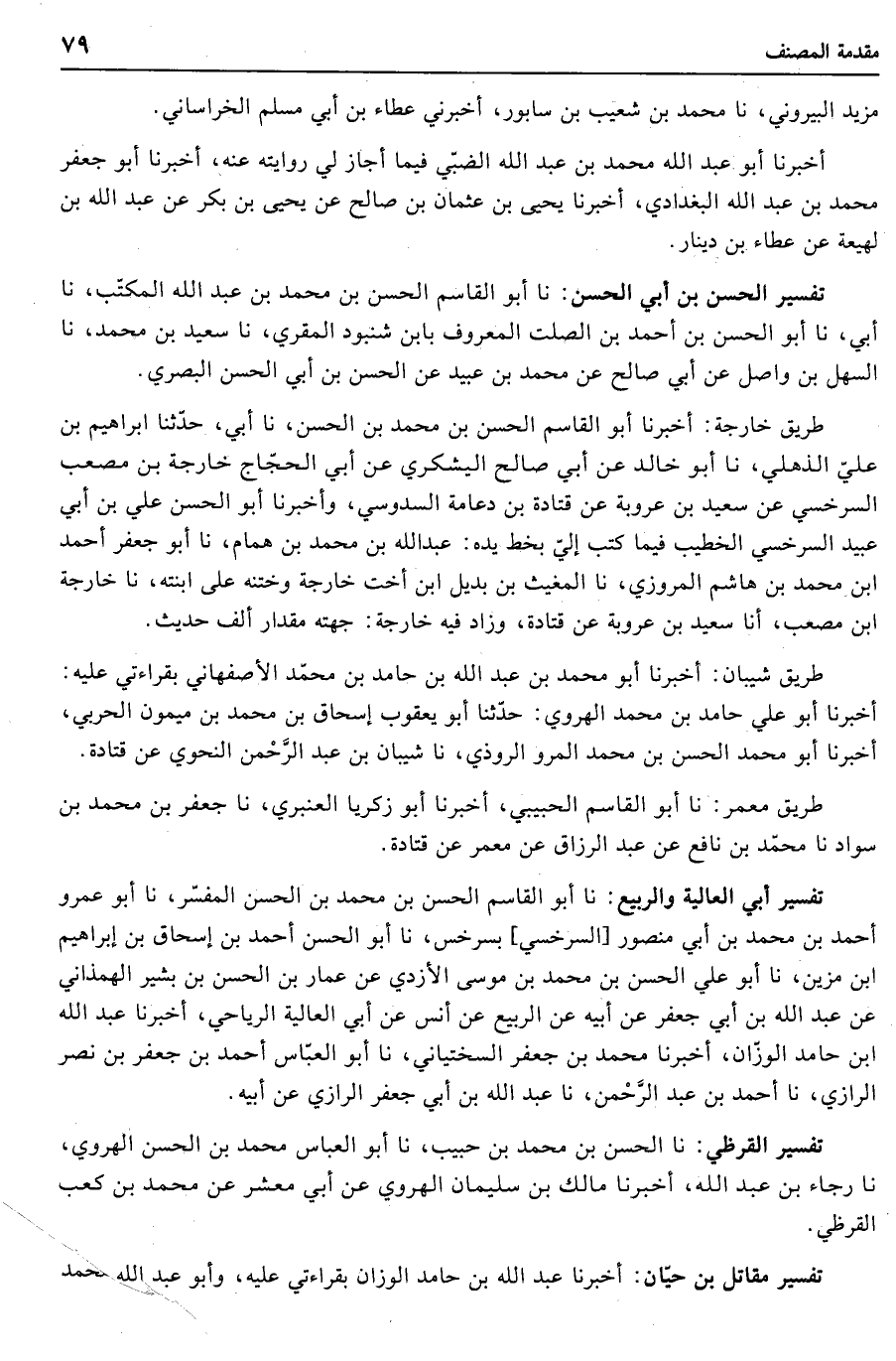 أخبرنا أبو علي حامد بن محمد الهروي: حدّثنا أبو يعقوب إسحاق بن محمد بن ميمون الحربي، أخبرنا أبو محمد الحسن بن محمد المرو الروذي، نا شيبان بن عبد الرّحمن النحوي عن قتادة.