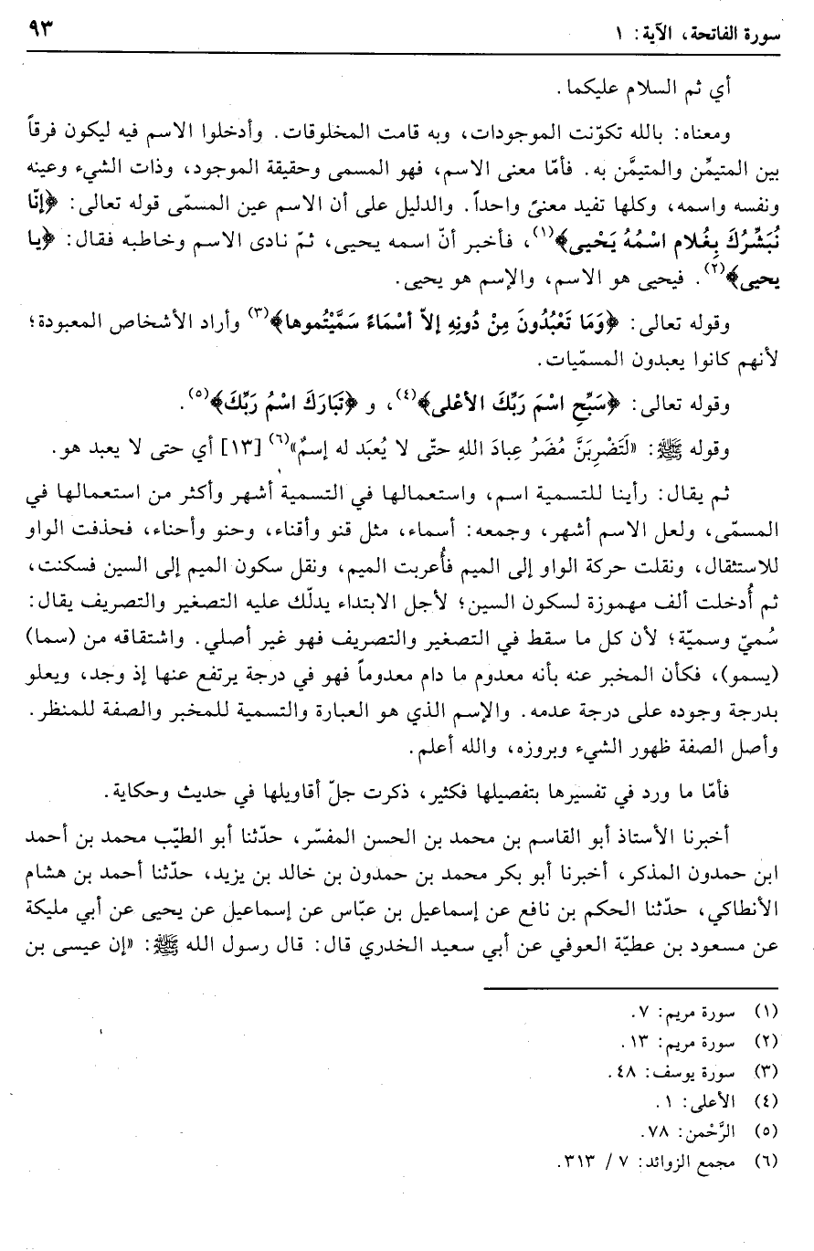 ومعناه: بالله تكوّنت الموجودات، وبه قامت المخلوقات. وأدخلوا الاسم فيه ليكون فرقا بين المتيمّن والمتيمّن به. فأمّا معنى الاسم، فهو المسمى وحقيقة الموجود، وذات الشيء وعينه ونفسه واسمه، وكلها تفيد معنى واحدا. والدليل على أن الاسم عين المسمّى قوله تعالى: إِنَّا نُبَشِّرُكَ بِغُلامٍ اسْمُهُ يَحْيى «1» ، فأخبر أنّ اسمه يحيى، ثمّ نادى الاسم وخاطبه فقال: يا يَحْيى «2» . فيحيى هو الاسم، والإسم هو يحيى.