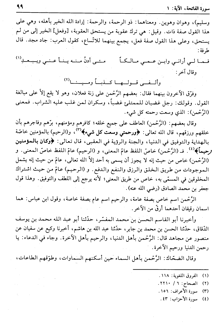 وقال بعضهم: (الرَّحْمنِ) العاطف على جميع خلقه كافرهم ومؤمنهم، برّهم وفاجرهم بأن خلقهم ورزقهم، قال الله تعالى: وَرَحْمَتِي وَسِعَتْ كُلَّ شَيْءٍ «3» ، و (الرَّحِيمِ) بالمؤمنين خاصّة بالهداية والتوفيق في الدنيا، والجنة والرؤية في العقبى، قال تعالى: وَكانَ بِالْمُؤْمِنِينَ رَحِيماً «4» .