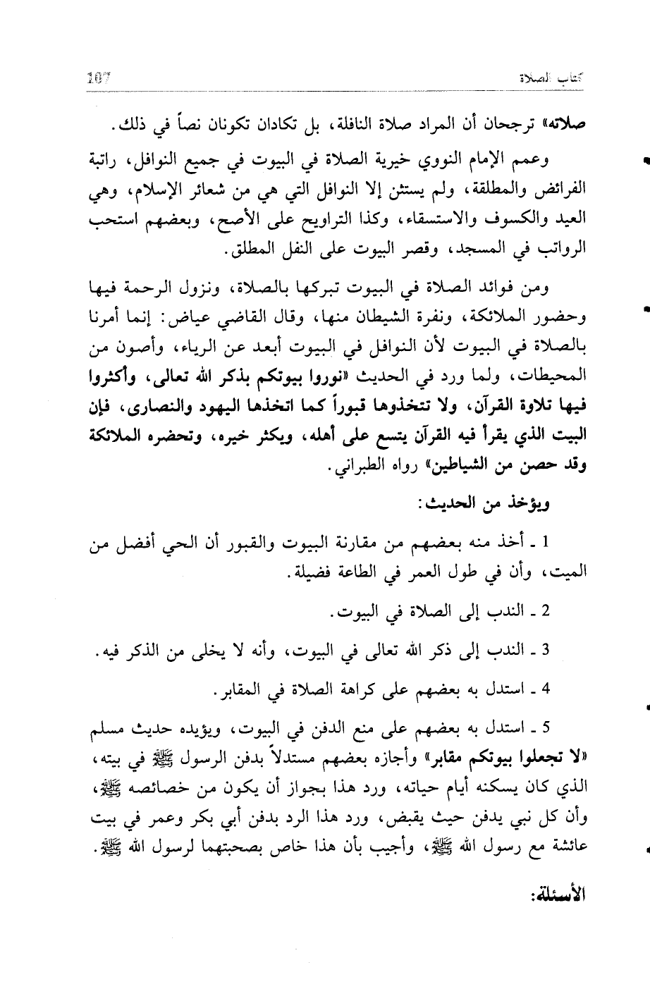 5 - استدل به بعضهم على منع الدفن في البيوت، ويؤيده حديث سلم "لا تجعلوا بيوتكم مقابر" وأجازه بعضهم مستدلا بدفن الرسول صلى الله عليه وسلم في بيته، الذي كان يسكنه أيام حياته، ورد هذا بجواز أن يكون من خصائصه صلى الله عليه وسلم، وأن كل نبي يدفن حيث يقبض، ورد هذا الرد بدفن أبي بكر وعمر في بيت عائشة مع رسول الله صلى الله عليه وسلم، وأجيب بأن هذا خاص بصحبتهما لرسول الله صلى الله عليه وسلم.