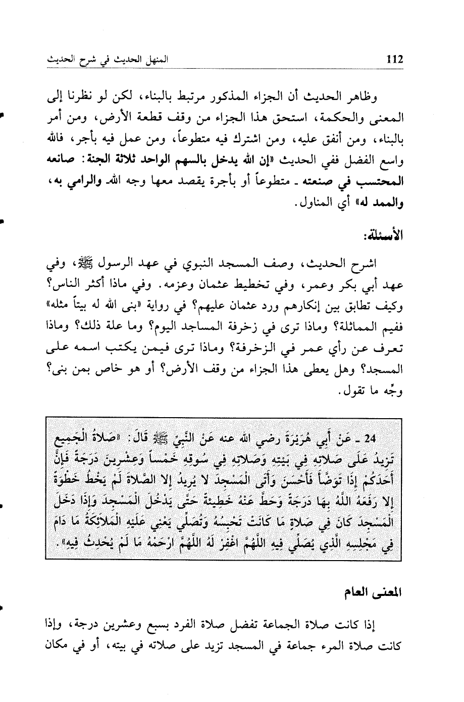 24 - عن أبي هريرة رضي الله عنه عن النبي صلى الله عليه وسلم قال: "صلاة الجميع تزيد على صلاته في بيته وصلاته في سوقه خمسا وعشرين درجة فإن أحدكم إذا توضأ فأحسن وأتى المسجد لا يريد إلا الصلاة لم يخط خطوة إلا رفعه الله بها درجة وحط عنه خطيئة حتى يدخل المسجد وإذا دخل المسجد كان في صلاة ما كانت تحبسه وتصلي يعني عليه الملائكة ما دام في مجلسه الذي يصلي فيه اللهم اغفر له اللهم ارحمه ما لم يحدث فيه".