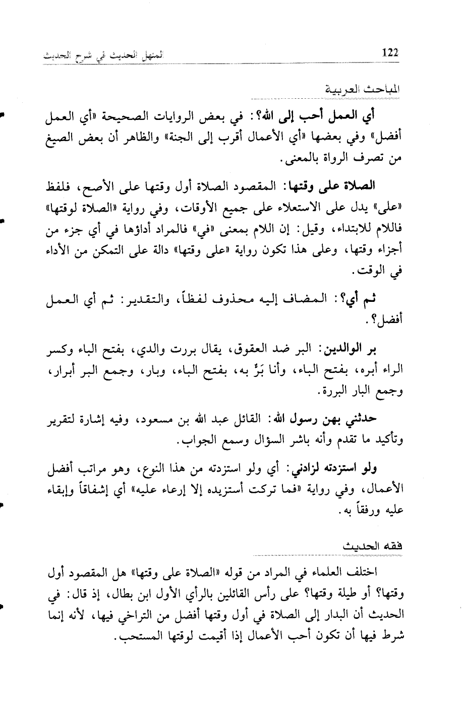 (الصلاة على وقتها) المقصود الصلاة أول وقتها على الأصح، فلفظ "على" يدل على الاستعلاء على جميع الأوقات، وفي رواية "الصلاة لوقتها" فاللام للابتداء، وقيل: إن اللام بمعنى "في" فالمراد أداؤها في أي جزء من أجزاء وقتها. وعلى هذا تكون رواية "على وقتها" دالة على التمكن من الأداء في الوقت.