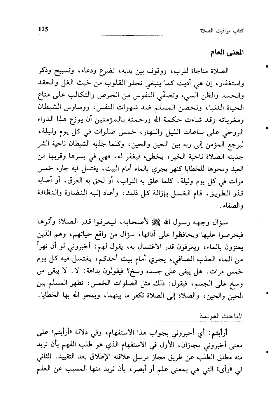 سؤال وجهه رسول الله صلى الله عليه وسلم لأصحابه، ليعرفوا قدر الصلاة وأثرها فيحرصوا عليها ويحافظوا على أدائها، سؤال من واقع حياتهم، وهم الذين يعتزون بالماء، ويعرفون قدر الاغتسال به، يقول لهم: أخبروني لو أن نهرا من الماء العذب الصافي، يجري أمام بيت أحدكم، يغتسل فيه كل يوم خمس مرات. هل يبقى على جسده وسخ؟ فيقولون بداهة: لا. لا يبقى من وسخ على الجسم، فيقول: ذلك مثل الصلوات الخمس، تطهر المسلم بين الحين والحين، والصلاة إلى الصلاة تكفر ما بينهما، ويمحو الله بها الخطايا.