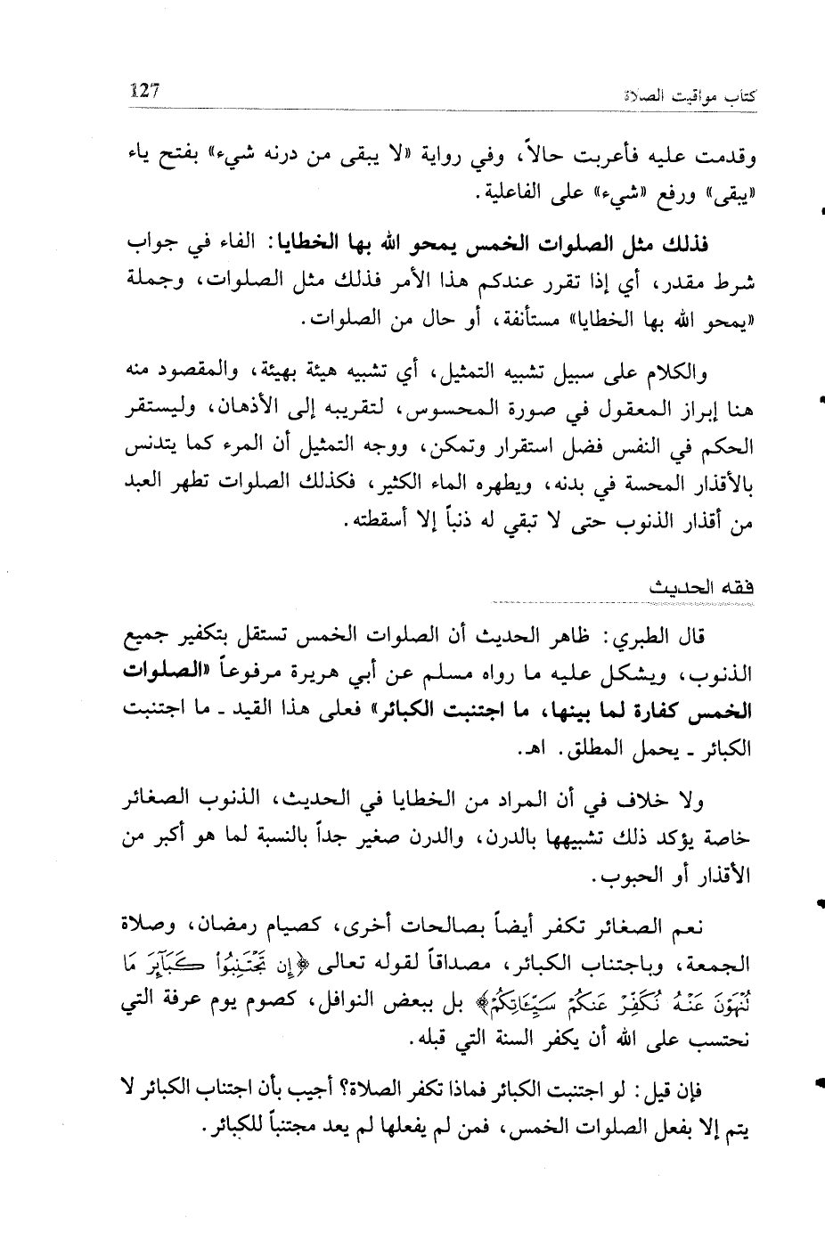 قال الطبري: ظاهر الحديث أن الصلوات الخمس تستقل بتكفير جميع الذنوب، ويشكل عليه ما رواه مسلم عن أبي هريرة مرفوعا "الصلوات الخمس كفارة لما بينها، ما اجتنبت الكبائر" فعلى هذا القيد [ما اجتنبت الكبائر] يحمل المطلق. اهـ.