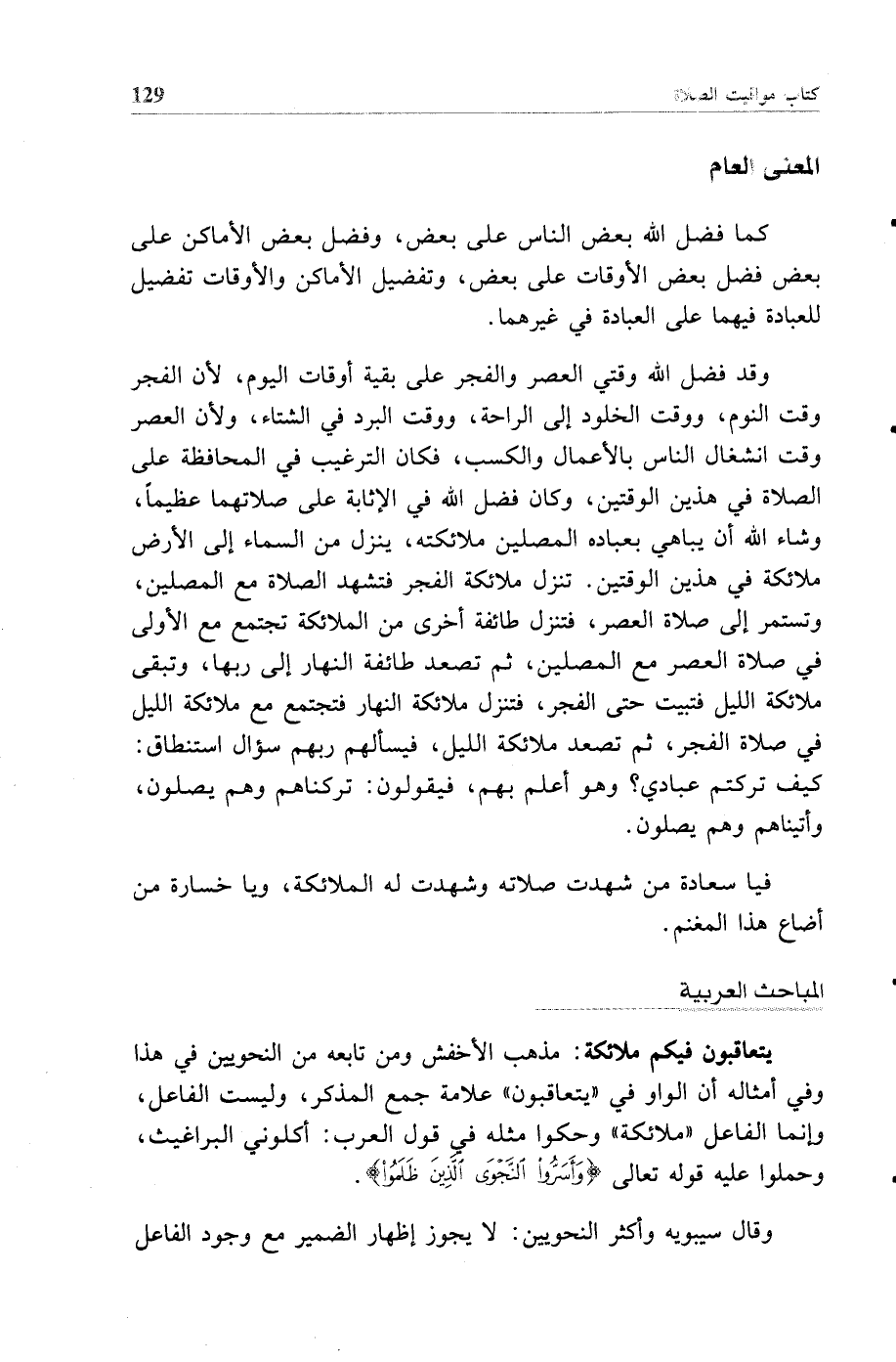 وقد فضل الله وقتي العصر والفجر على بقية أوقات اليوم، لأن الفجر وقت النوم، ووقت الخلود إلى الراحة، ووقت البرد في الشتاء، ولأن العصر وقت انشغال الناس بالأعمال والكسب، فكان الترغيب في المحافظة على الصلاة في هذين الوقتين، وكان فضل الله في الإثابة على صلاتهما عظيما، وشاء الله أن يباهي بعباده المصلين ملائكته، ينزل من السماء إلى الأرض ملائكة في هذين الوقتين. تنزل ملائكة الفجر فتشهد الصلاة مع المصلين، وتستمر إلى صلاة العصر، فتنزل طائفة أخرى من الملائكة تجتمع مع الأولى في صلاة العصر مع المصلين، ثم تصعد طائفة النهار إلى ربها، وتبقى ملائكة الليل فتبيت حتى الفجر، فتنزل ملائكة النهار فتجتمع مع ملائكة الليل في صلاة الفجر، ثم تصعد ملائكة الليل، فيسألهم ربهم سؤال استنطاق: كيف تركتم عبادي؟ وهو أعلم بهم، فيقولون: تركناهم وهم يصلون، وأتيناهم وهم يصلون.