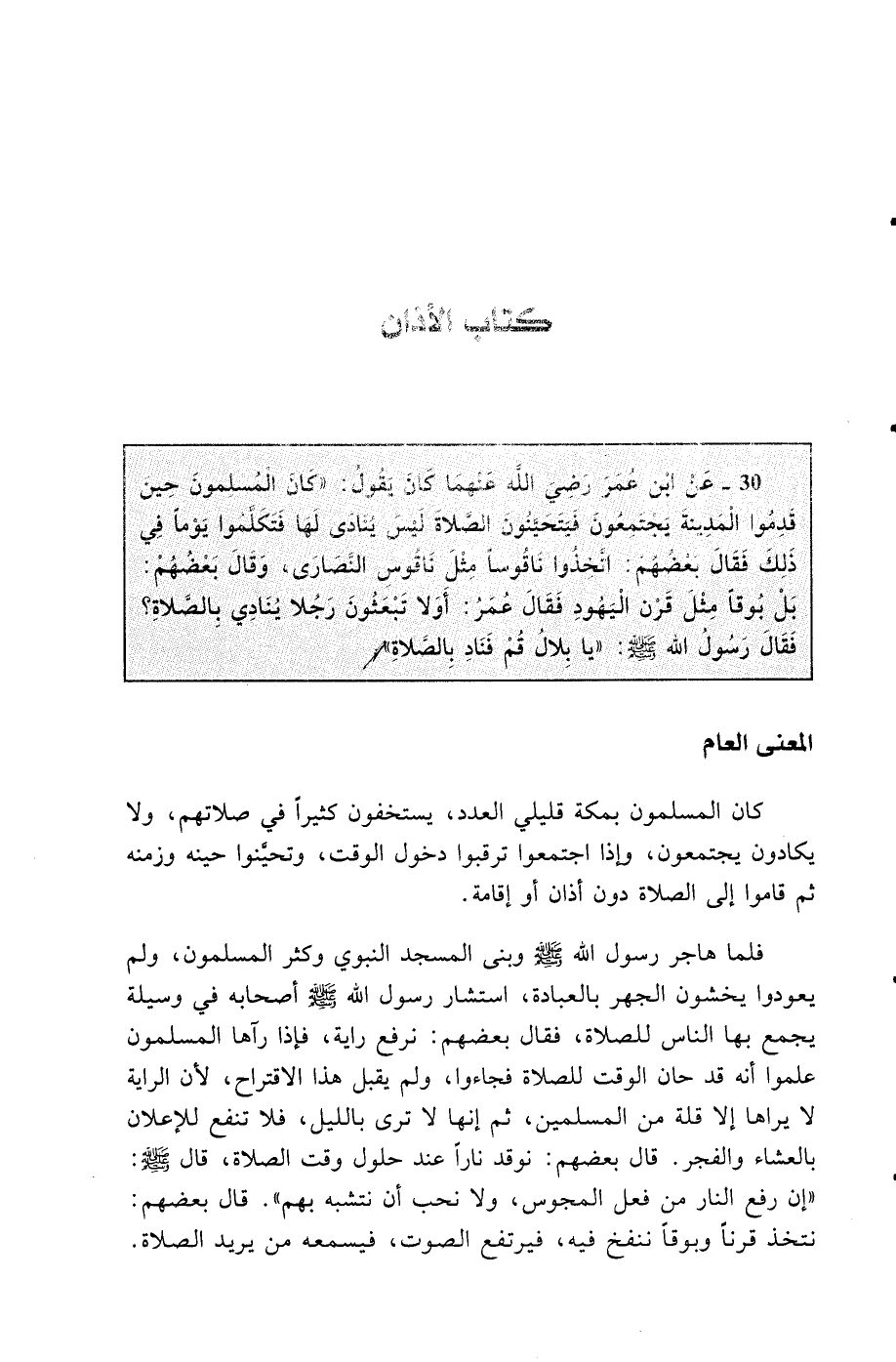30 - عن ابن عمر رضي الله عنهما كان يقول: "كان المسلمون حين قدموا المدينة يجتمعون فيتحينون الصلاة ليس ينادى لها فتكلموا يوما في ذلك فقال بعضهم: اتخذوا ناقوسا مثل ناقوس النصارى وقال بعضهم بل بوقا مثل قرن اليهود فقال عمر: أولا تبعثون رجلا ينادي بالصلاة؟ فقال رسول الله صلى الله عليه وسلم: يا بلال قم فناد بالصلاة".