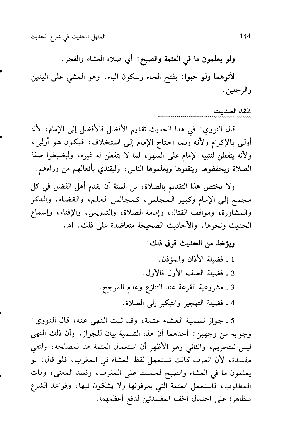 5 - جواز تسمية العشاء عتمة، وقد ثبت النهي عنه، قال النووي: وجوابه من وجهين. أحدهما أن هذه التسمية بيان للجواز، وأن ذلك النهي ليس للتحريم، والثاني وهو الأظهر أن استعمال العتمة هنا لمصلحة، ولنفي مفسدة، لأن العرب كانت تستعمل لفظ العشاء في المغرب، فلو قال: لو يعلمون ما في العشاء والصبح لحملت على المغرب، وفسد المعنى، وفات المطلوب، فاستعمل العتمة التي يعرفونها ولا يشكون فيها، وقواعد الشرع متظاهرة على احتمال أخف المفسدتين لدفع أعظمهما.