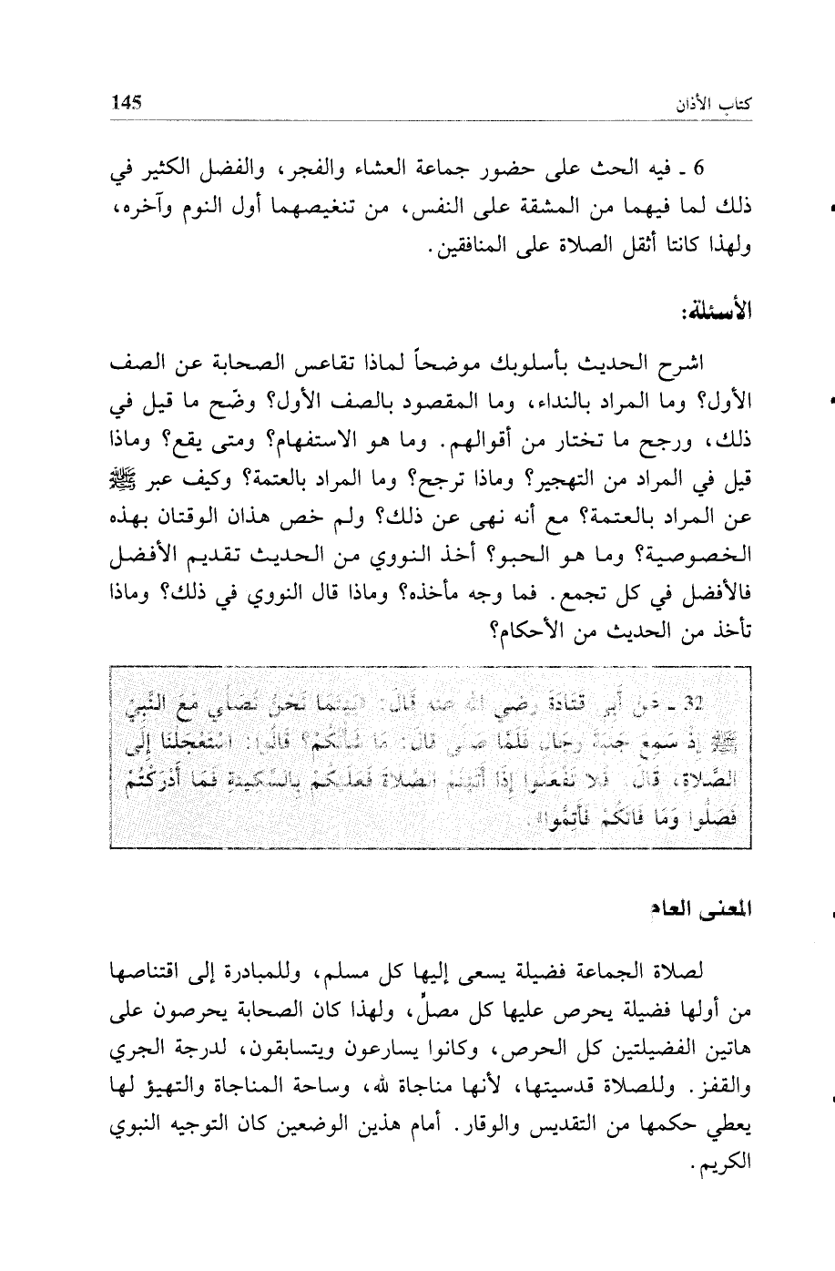 32 - عن أبي قتادة رضي الله عنه قال: "بينما نحن نصلي مع النبي صلى الله عليه وسلم إذ سمع جلبة رجال فلما صلى قال: ما شأنكم؟ قالوا: استعجلنا إلى الصلاة قال فلا تفعلوا إذا أتيتم الصلاة فعليكم بالسكينة فما أدركتم فصلوا وما فاتكم فأتموا".