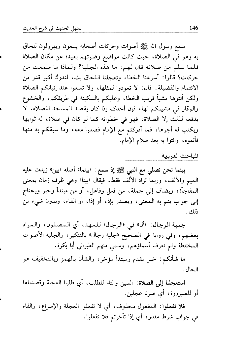 سمع رسول الله صلى الله عليه وسلم أصوات وحركات أصحابه يسعون ويهرولون للحاق به وهو في الصلاة، حيث كانت مواضع وضوئهم بعيدة عن مكان الصلاة فلما سلم من صلاته قال لهم: ما هذه الجلبة؟ ولماذا ما سمعت من حركات؟ قالوا: أسرعنا الخطا، وتعجلنا اللحاق بك، لندرك أكبر قدر من الائتمام والفضيلة. قال: لا تعودوا لمثلها، ولا تسعوا عند إتيانكم الصلاة ولكن ائتوها مشيا قريب الخطا، وعليكم بالسكينة في طريقكم، والخشوع والوقار في مشيتكم لها، فإن أحدكم إذا كان يقصد المسجد للصلاة، لا يدفعه لذلك إلا الصلاة، فهو في خطواته كما لو كان في صلاة، له ثوابها ويكتب له أجرها، فما أدركتم مع الإمام فصلوا معه، وما سبقكم به منها فأتموه، وائتوا به بعد سلام الإمام.