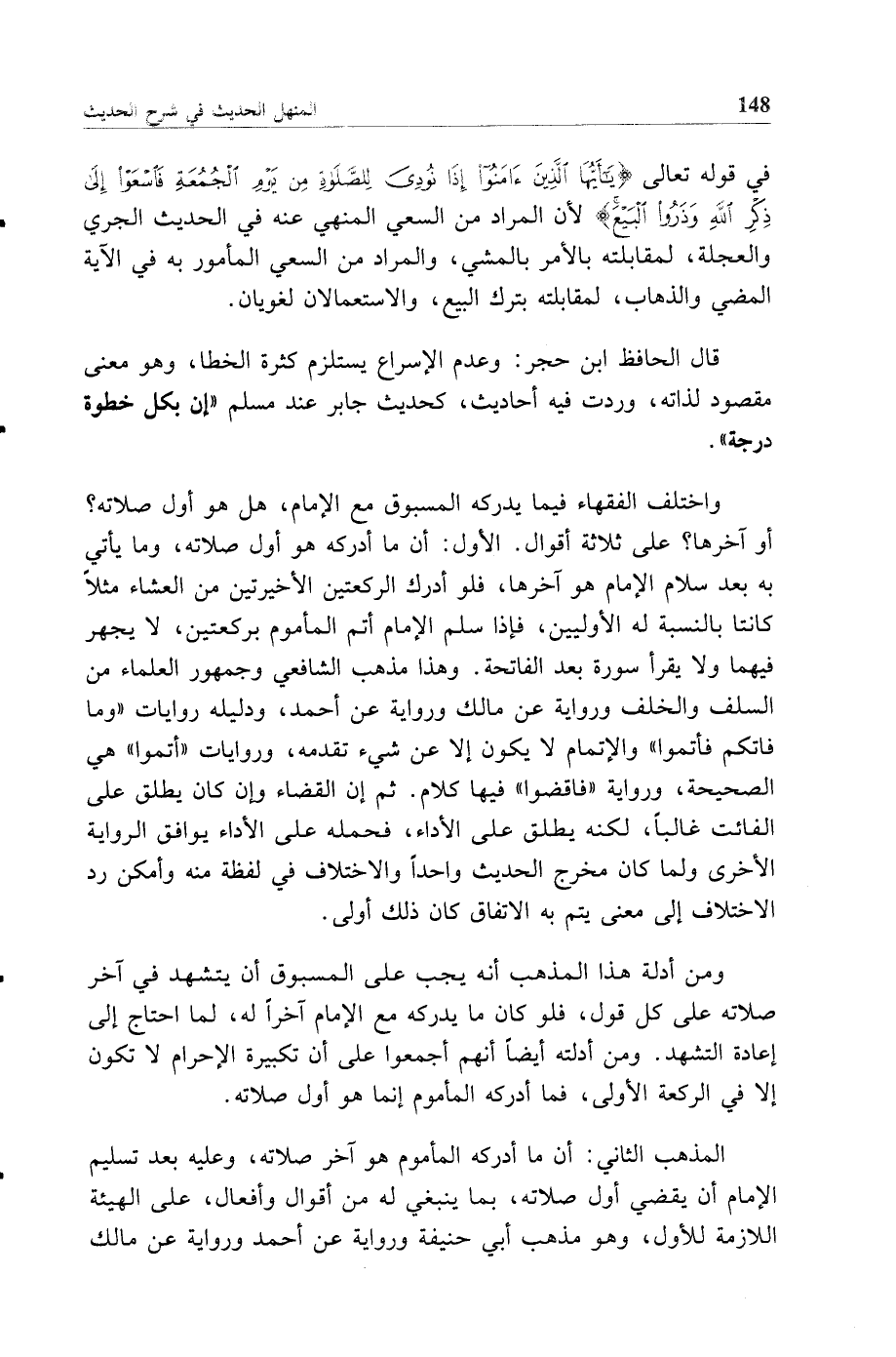 واختلف الفقهاء فيما يدركه المسبوق مع الإمام، هل هو أول صلاته؟ أو آخرها؟ على ثلاثة أقوال. الأول: أن ما أدركه هو أول صلاته، وما يأتي به بعد سلام الإمام هو آخرها، فلو أدرك الركعتين الأخيرتين من العشاء مثلا كانتا بالنسبة له الأوليين، فإذا سلم الإمام أتم المأموم بركعتين، لا يجهر فيهما ولا يقرأ سورة بعد الفاتحة. وهذا مذهب الشافعي وجمهور العلماء من السلف والخلف ورواية عن مالك ورواية عن أحمد، ودليله روايات "وما فاتكم فأتموا" والإتمام لا يكون إلا عن شيء تقدمه، وروايات "أتموا" هي الصحيحة، ورواية "فاقضوا" فيها كلام. ثم إن القضاء وإن كان يطلق على الفائت غالبا، لكنه يطلق على الأداء، فحمله على الأداء يوافق الرواية الأخرى ولما كان مخرج الحديث واحدا والاختلاف في لفظة منه وأمكن رد الاختلاف إلى معنى يتم به الاتفاق كان ذلك أولى.