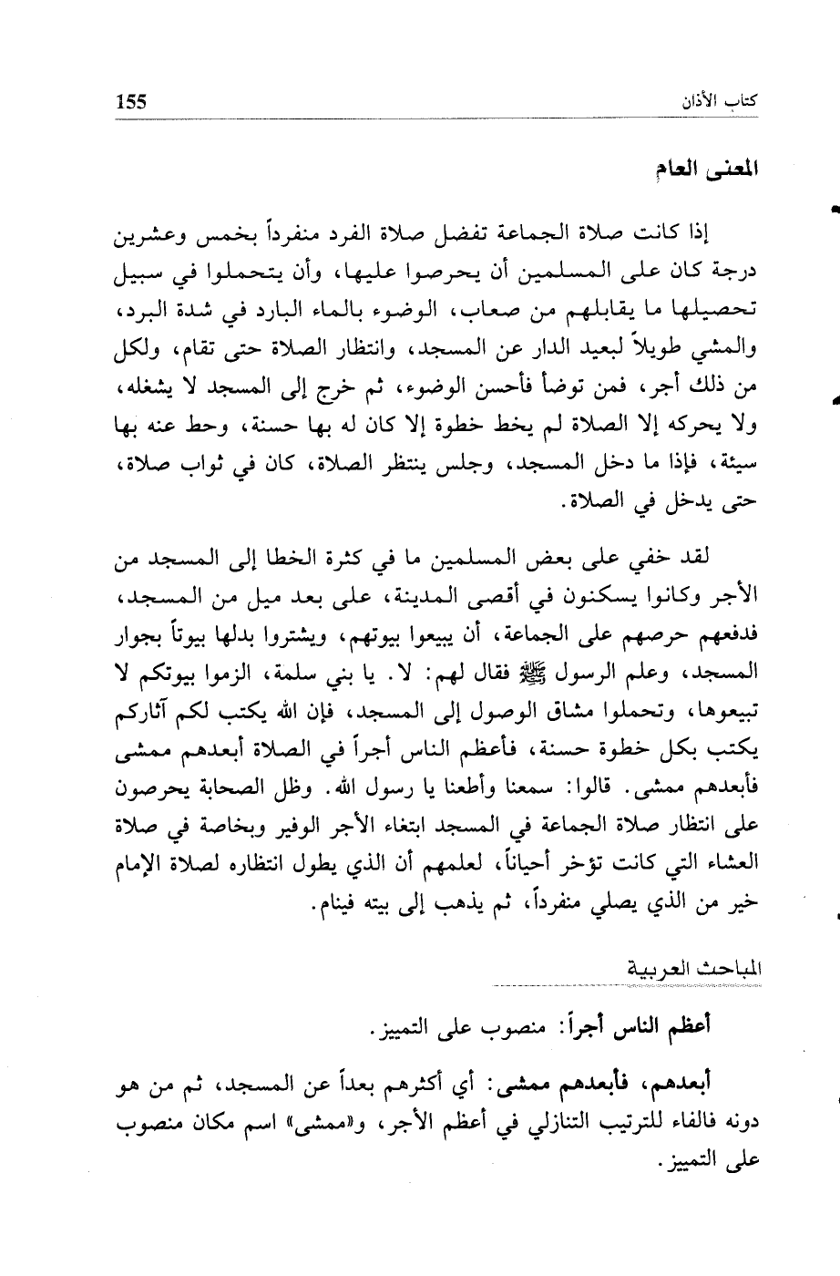 (أبعدهم، فأبعدهم ممشى) أي أكثرهم بعدا عن المسجد، ثم من هو دونه فالفاء للترتيب التنازلي في أعظم الأجر، و"ممشى" اسم مكان منصوب على التمييز.