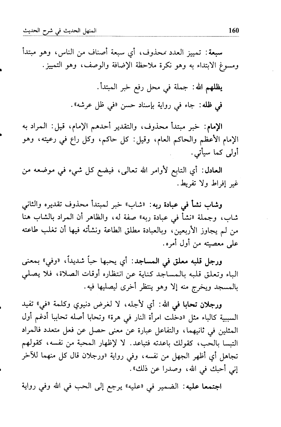 (وشاب نشأ في عبادة ربه) "شاب" خبر لمبتدأ محذوف تقديره والثاني شاب، وجملة "نشأ في عبادة ربه" صفة له، والظاهر أن المراد بالشاب هنا من لم يجاوز الأربعين، وبالعبادة مطلق الطاعة ونشأته فيها أن تغلب طاعته على معصيته من أول أمره.