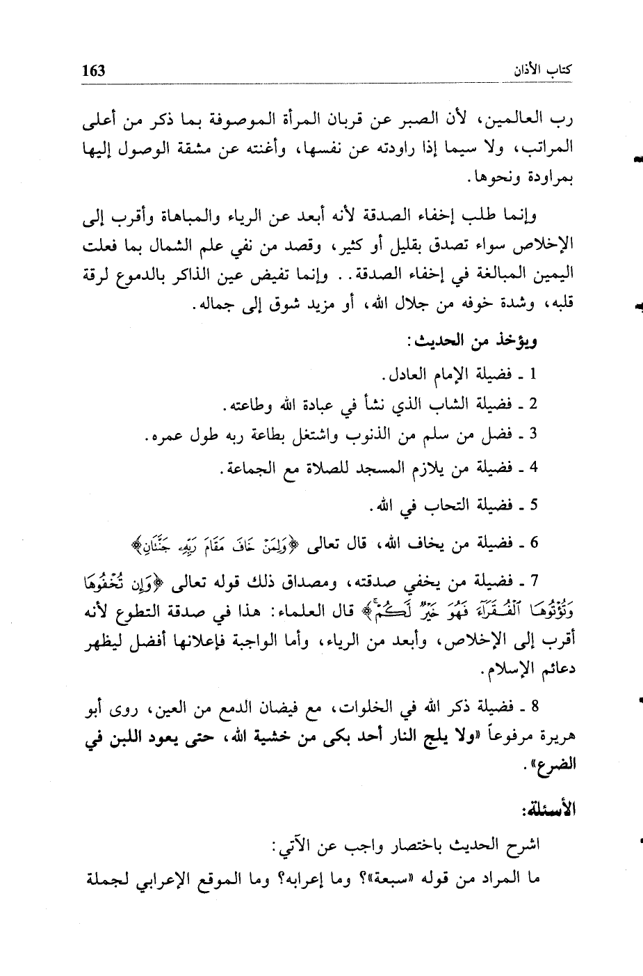 وإنما طلب إخفاء الصدقة لأنه أبعد عن الرياء والمباهاة وأقرب إلى الإخلاص سواء تصدق بقليل أو كثير، وقصد من نفي علم الشمال بما فعلت اليمين المبالغة في إخفاء الصدقة ... وإنما تفيض عين الذاكر بالدموع لرقة قلبه، وشدة خوفه من جلال الله، أو مزيد شوق إلى جماله.