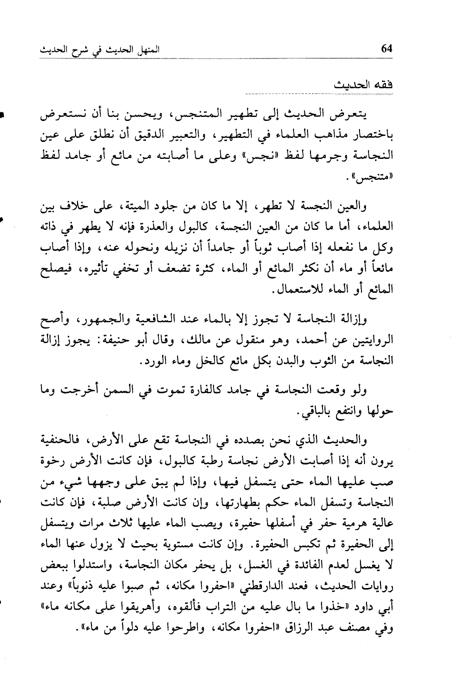 والحديث الذي نحن بصدده في النجاسة تقع على الأرض، فالحنفية يرون أنه إذا أصابت الأرض نجاسة رطبة كالبول، فإن كانت الأرض رخوة صب عليها الماء حتى يتسفل فيها، وإذا لم يبق على وجهها شيء من النجاسة وتسفل الماء حكم بطهارتها، وإن كانت الأرض صلبة، فإن كانت عالية هرمية حفر في أسفلها حفيرة، ويصب الماء عليها ثلاث مرات ويتسفل إلى الحفيرة ثم تكبس الحفيرة. وإن كانت مستوية بحيث لا يزول عنها الماء لا يغسل لعدم الفائدة في الغسل، بل يحفر مكان النجاسة، واستدلوا ببعض روايات الحديث، فعند الدارقطني "احفروا مكانه"، ثم صبوا عليه ذنوبا" وعند أبي داود "خذوا ما بال عليه من التراب فألقوه، وأهريقوا على مكانه ماء" وفي مصنف عبد الرزاق "احفروا مكانه، واطرحوا عليه دلوا من ماء".