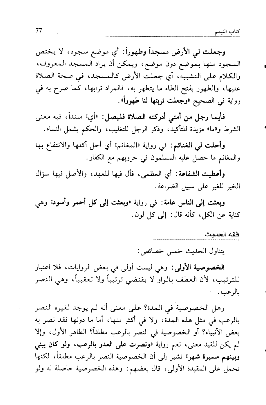 الخصوصية الأولى: وهي ليست أولى في بعض الروايات، فلا اعتبار للترتيب، لأن العطف بالواو لا يقتضي ترتيبا ولا تعقيبا، وهي النصر بالرعب.