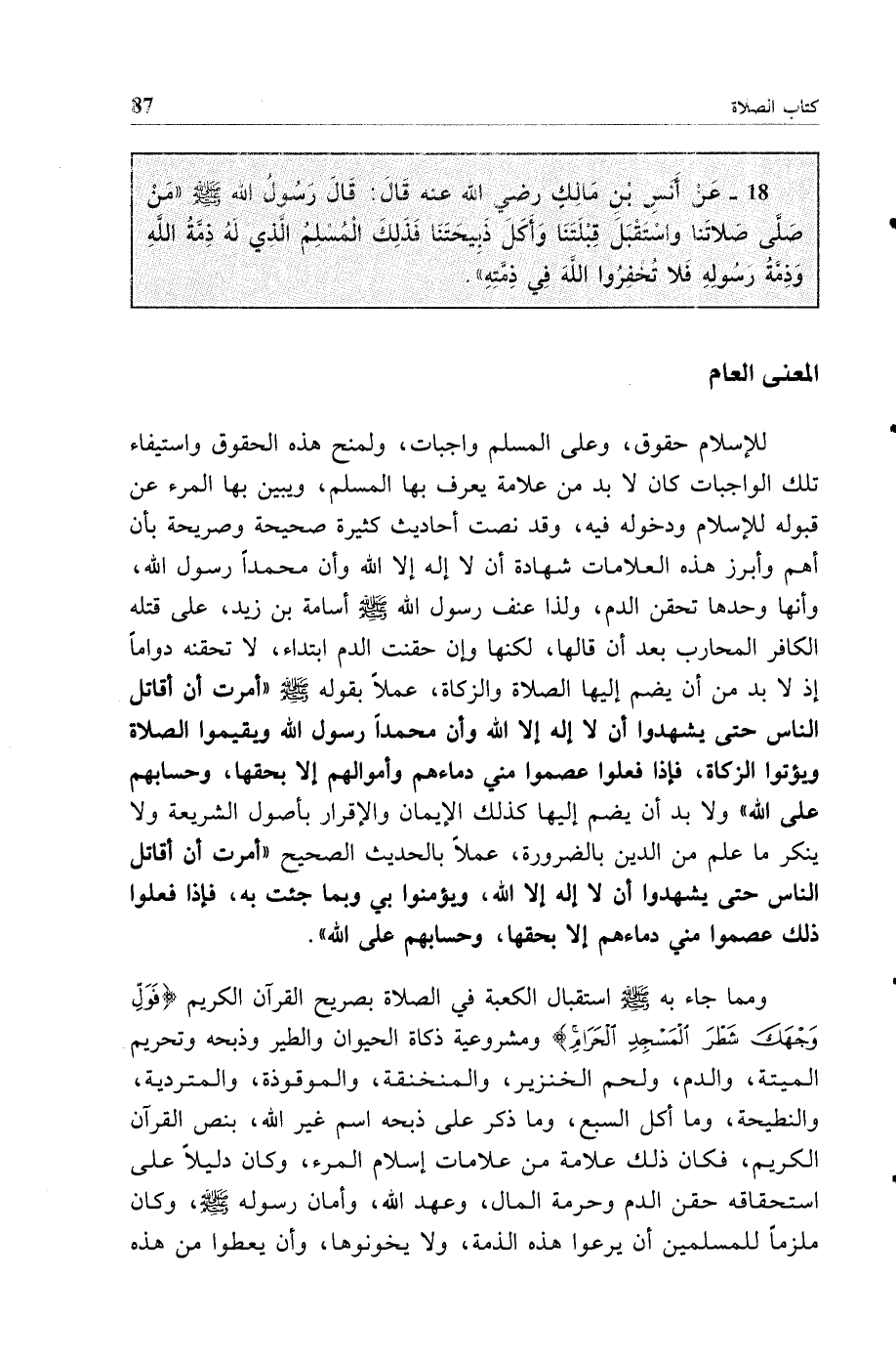 18 - عن أنس بن مالك رضي الله عنه قال: قال رسول الله صلى الله عليه وسلم "من صلى صلاتنا واستقبل قبلتنا وأكل ذبيحتنا فذلك المسلم الذي له ذمة الله وذمة رسوله فلا تخفروا الله في ذمته".