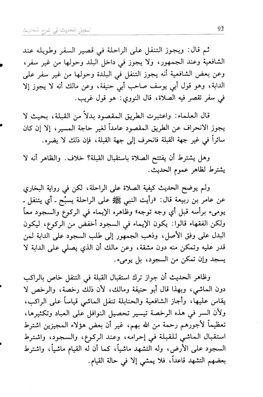 ثم قال: ويجوز التنفل على الراحلة في قصير السفر وطويله عند الشافعية وعند الجمهور، ولا يجوز في داخل البلد وحولها من غير سفر، وعن بعض الشافعية أنه يجوز التنفل في البلدة وحولها من غير سفر على الدابة، وهو قول أبي يوسف صاحب أبي حنيفة، وعن مالك أنه لا يجوز إلا في سفر تقصر فيه الصلاة، قال النووي: هو قول غريب.