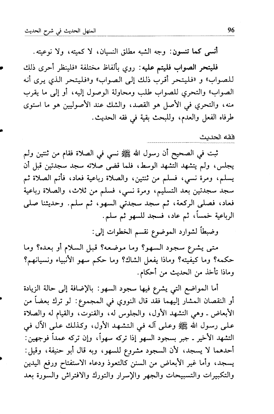 (فليتحر الصواب فليتم عليه) روي بألفاظ مختلفة "فلينظر أحرى ذلك للصواب "وفليتحر أقرب ذلك إلى الصواب" و "فليتحر الذي يرى أنه الصواب" والتحري للصواب طلب ومحاولة الوصول إليه، أو إلى ما يقرب منه، والتحري في الأصل هو القصد، والشك عند الأصوليين هو ما استوى طرفاه الفعل والعدم، وللبحث بقية في فقه الحديث.