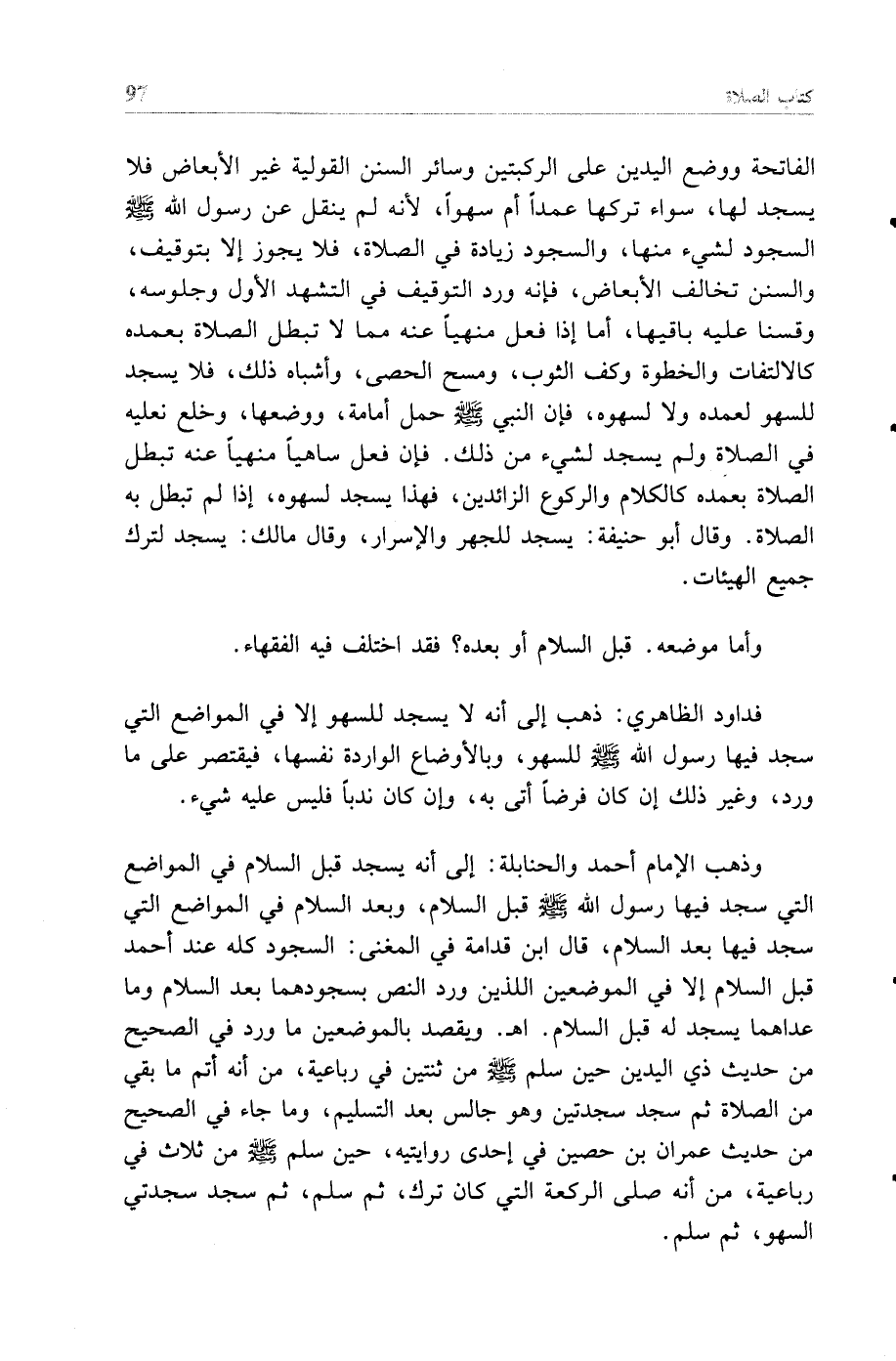 الفاتحة ووضع اليدين على الركبتين وسائر السنن القولية غير الأبعاض فلا يسجد لها، سواء تركها عمدا أم سهوا، لأنه لم ينقل عن رسول الله صلى الله عليه وسلم السجود لشيء منها، والسجود زيادة في الصلاة، فلا يجوز إلا بتوقيف، والسنن تخالف الأبعاض، فإنه ورد التوقيف في التشهد الأول وجلوسه، وقسنا عليه باقيها، أما إذا فعل منهيا عنه مما لا تبطل الصلاة بعمده كالالتفات والخطوة وكف الثوب، ومسح الحصى، وأشباه ذلك، فلا يسجد للسهو لعمده ولا لسهوه، فإن النبي صلى الله عليه وسلم حمل أمامة، ووضعها، وخلع نعليه في الصلاة ولم يسجد لشيء من ذلك. فإن فعل ساهيا منهيا عنه تبطل الصلاة بعمده كالكلام والركوع الزائدين، فهذا يسجد لسهوه، إذا لم تبطل به الصلاة. وقال أبو حنيفة: يسجد للجهر والإسرار، وقال مالك: يسجد لترك جميع الهيئات. وأما موضعه. قبل السلام أو بعده؟ فقد اختلف فيه الفقهاء.
