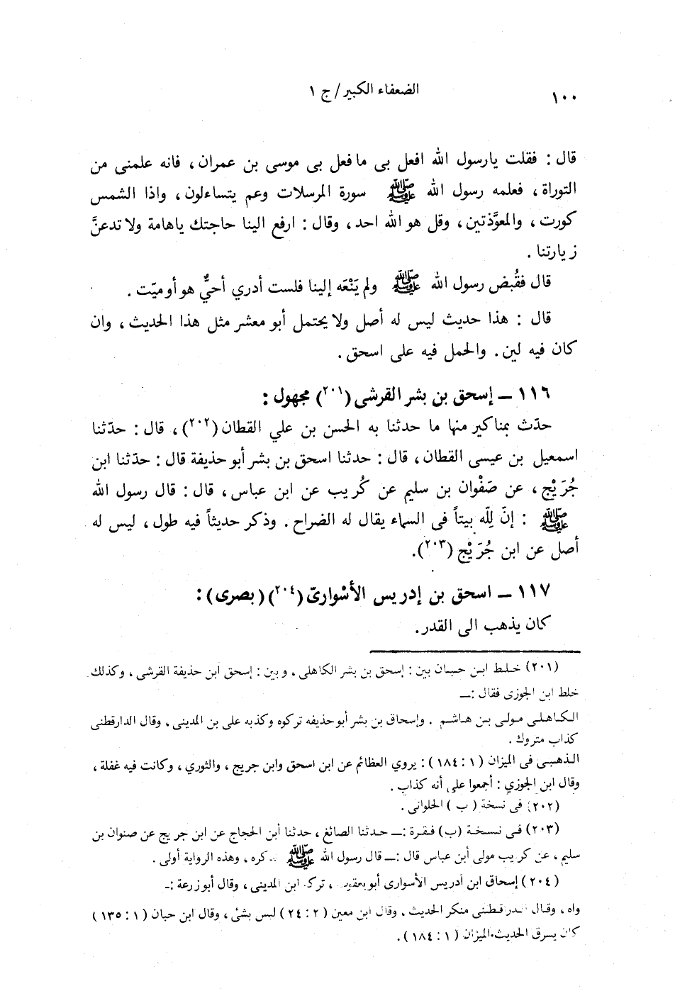 §117 - إِسْحَاقُ بْنُ إِدْرِيسَ الْأُسْوَارِيُّ بَصْرِيٌّ كَانَ يَذْهَبُ إِلَى الْقَدَرِ حَدَّثَنَا ابْنُ الْأَعْرَابِيِّ قَالَ: سَمِعْتُ عَبَّاسَ بْنَ مُحَمَّدٍ قَالَ: سَمِعْتُ يَحْيَى يَقُولُ: إِسْحَاقُ بْنُ إِدْرِيسَ الْأُسْوَارِيُّ كَذَّابٌ. حَدَّثَنَا آدَمُ بْنُ مُوسَى قَالَ: سَمِعْتُ الْبُخَارِيَّ يَقُولُ: إِسْحَاقُ بْنُ إِدْرِيسَ الْأُسْوَارِيُّ الْبَصْرِيُّ تَرَكَهُ النَّاسُ. وَحَدَّثَنَا آدَمُ بْنُ مُوسَى قَالَ: سَمِعْتُ الْبُخَارِيَّ يَقُولُ: إِسْحَاقُ بْنُ إِدْرِيسَ الْأُسْوَارِيُّ الْبَصْرِيُّ كَذَّابٌ. حَدَّثَنَا مُحَمَّدُ بْنُ عِيسَى قَالَ: حَدَّثَنَا عَبَّاسُ بْنُ مُحَمَّدٍ قَالَ: سَمِعْتُ يَحْيَى بْنَ مَعِينٍ يَقُولُ: إِسْحَاقُ بْنُ إِدْرِيسَ بُصْرَىٌّ لَيْسَ بِشَيْءٍ يَضَعُ الْأَحَادِيثَ