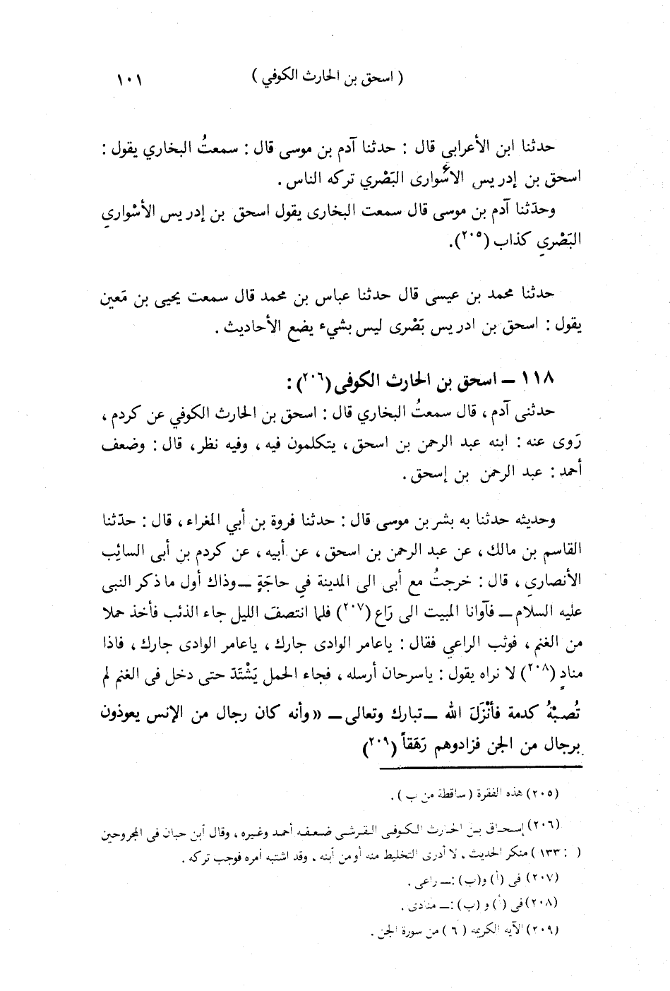 §118 - إِسْحَاقُ بْنُ الْحَارِثِ الْكُوفِيُّ حَدَّثَنِي آدَمُ قَالَ: سَمِعْتُ الْبُخَارِيَّ قَالَ: إِسْحَاقُ بْنُ الْحَارِثِ الْكُوفِيُّ عَنْ كَرْدَمٍ رَوَى عَنْهُ ابْنُهُ عَبْدُ الرَّحْمَنِ بْنُ إِسْحَاقَ، يَتَكَلَّمُونَ فِيهِ، وَفِيهِ نَظَرٌ، قَالَ: وَضَعَّفَ أَحْمَدُ: عَبْدَ الرَّحْمَنِ بْنَ إِسْحَاقَ