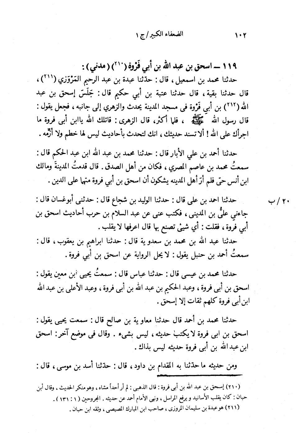 §119 - إِسْحَاقُ بْنُ عَبْدِ اللَّهِ بْنِ أَبِي فَرْوَةَ مَدَنِيٌّ حَدَّثَنَا مُحَمَّدُ بْنُ إِسْمَاعِيلَ قَالَ: حَدَّثَنَا عَبْدَةُ بْنُ عَبْدِ الرَّحِيمِ الْمَرْوَزِيُّ قَالَ: حَدَّثَنَا بَقِيَّةُ قَالَ: حَدَّثَنَا عُتْبَةُ بْنُ أَبِي حَكِيمٍ قَالَ: جَلَسَ إِسْحَاقُ بْنُ عَبْدِ اللَّهِ بْنِ أَبِي فَرْوَةَ فِي مَسْجِدِ الْمَدِينَةِ يُحَدِّثُ، وَالزُّهْرِيُّ إِلَى جَانِبِهِ فَجَعَلَ يَقُولُ: قَالَ رَسُولُ اللَّهِ صَلَّى اللهُ عَلَيْهِ وَسَلَّمَ. . . فَلَمَّا أَكْثَرَ، قَالَ الزُّهْرِيُّ: قَاتَلَكَ اللَّهُ يَا ابْنَ أَبِي فَرْوَةَ مَا أَجْرَأَكَ عَلَى اللَّهِ، أَلَا تَسْنِدُ حَدِيثَكَ، إِنَّكَ لَتُحَدِّثُ بِأَحَادِيثَ لَيْسَ لَهَا خُطُمٌ وَلَا أَزِمَّةٌ. حَدَّثَنَا أَحْمَدُ بْنُ عَلِيٍّ الْأَبَّارُ قَالَ: حَدَّثَنَا مُحَمَّدُ بْنُ عَبْدِ اللَّهِ بْنِ عَبْدِ الْحَكَمِ قَالَ: سَمِعْتُ مُحَمَّدَ بْنَ عَاصِمٍ الْمِصْرِيَّ - فَكَانَ مِنْ أَهْلِ الصِّدْقِ -، قَالَ: قَدِمْتُ الْمَدِينَةَ وَمَالِكُ بْنُ أَنَسٍ حَيٌّ فَلَمْ أَرَ أَهْلَ الْمَدِينَةِ يَشُكُّونَ أَنَّ إِسْحَاقَ بْنَ أَبِي فَرْوَةَ مُتَّهَمٌ عَلَى الدِّينِ. حَدَّثَنَا أَحْمَدُ بْنُ عَلِيٍّ قَالَ: حَدَّثَنَا الْوَلِيدُ بْنُ شُجَاعٍ قَالَ: حَدَّثَنِي أَبُو غَسَّانَ، قَالَ: جَاءَنِي عَلِيُّ بْنُ الْمَدِينِيِّ، فَكَتَبَ عَنِّي عَنْ عَبْدِ السَّلَامِ بْنِ حَرْبٍ أَحَادِيثَ إِسْحَاقَ بْنِ أَبِي فَرْوَةَ، فَقُلْتُ: أَيُّ شَيْءٍ تَصْنَعُ بِهَا؟ قَالَ: أَعْرِفُهَا لَا تُقْلَبُ. حَدَّثَنَا عَبْدُ اللَّهِ بْنُ مُحَمَّدِ بْنِ سَعْدَوَيْهِ قَالَ: حَدَّثَنَا إِبْرَاهِيمُ بْنُ يَعْقُوبَ قَالَ: سَمِعْتُ أَحْمَدَ بْنَ حَنْبَلٍ يَقُولُ: لَا يَحِلُّ الرِّوَايَةُ عَنْ إِسْحَاقَ بْنِ أَبِي فَرْوَةَ. حَدَّثَنَا مُحَمَّدُ بْنُ عِيسَى قَالَ: حَدَّثَنَا عَبَّاسٌ قَالَ: سَمِعْتُ يَحْيَى بْنَ مَعِينٍ يَقُولُ: إِسْحَاقُ بْنُ عَبْدِ اللَّهِ أَبِي فَرْوَةَ، وَعَبْدُ الْحَكِيمِ بْنُ عَبْدِ اللَّهِ بْنِ أَبِي فَرْوَةَ، وَعَبْدُ الْأَعْلَى بْنُ عَبْدِ اللَّهِ بْنِ أَبِي فَرْوَةَ، كُلُّهُمْ ثِقَاتٌ، إِلَّا إِسْحَاقَ. حَدَّثَنَا مُحَمَّدُ بْنُ أَحْمَدَ قَالَ: حَدَّثَنَا مُعَاوِيَةُ بْنُ صَالِحٍ قَالَ: سَمِعْتُ يَحْيَى يَقُولُ: إِسْحَاقُ بْنُ أَبِي فَرْوَةَ لَا يُكْتَبُ حَدِيثُهُ لَيْسَ بِشَيْءٍ وَقَالَ فِي مَوْضِعٍ آخَرَ: إِسْحَاقُ بْنُ عَبْدِ اللَّهِ بْنِ أَبِي فَرْوَةَ حَدِيثُهُ لَيْسَ بِذَاكَ