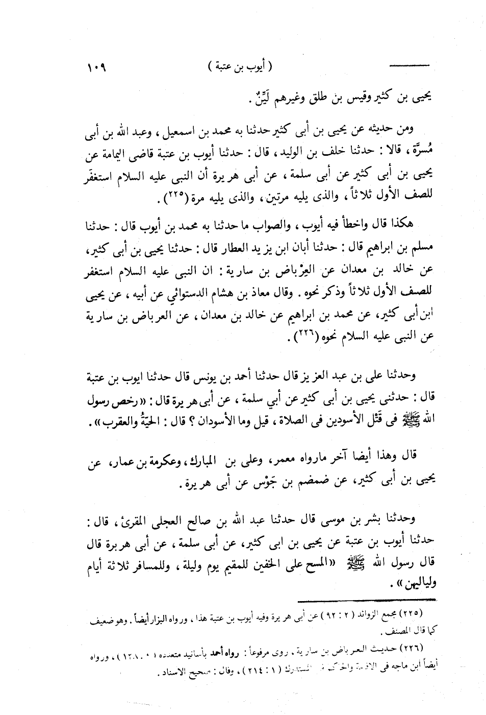 وَحَدَّثَنَا بِشْرُ بْنُ مُوسَى، قَالَ: حَدَّثَنَا عَبْدُ اللَّهِ بْنُ صَالِحٍ الْعِجْلِيُّ الْمُقْرِئُ، قَالَ: حَدَّثَنَا أَيُّوبُ بْنُ عُتْبَةَ، عَنْ يَحْيَى بْنِ أَبِي كَثِيرٍ، عَنْ أَبِي سَلَمَةَ، عَنْ أَبِي هُرَيْرَةَ، قَالَ: قَالَ رَسُولُ اللَّهِ صَلَّى اللهُ عَلَيْهِ وَسَلَّمَ: §«الْمَسْحُ عَلَى الْخُفَّيْنِ لِلْمُقِيمِ يَوْمٌ وَلَيْلَةٌ وَلِلْمُسَافِرِ ثَلَاثَةُ أَيَّامٍ وَلَيَالِيهِنَّ» قَالَ: وَهَذَا أَيْضًا خَطَأٌ فِي إِسْنَادِهِ وَمَتْنِهِ