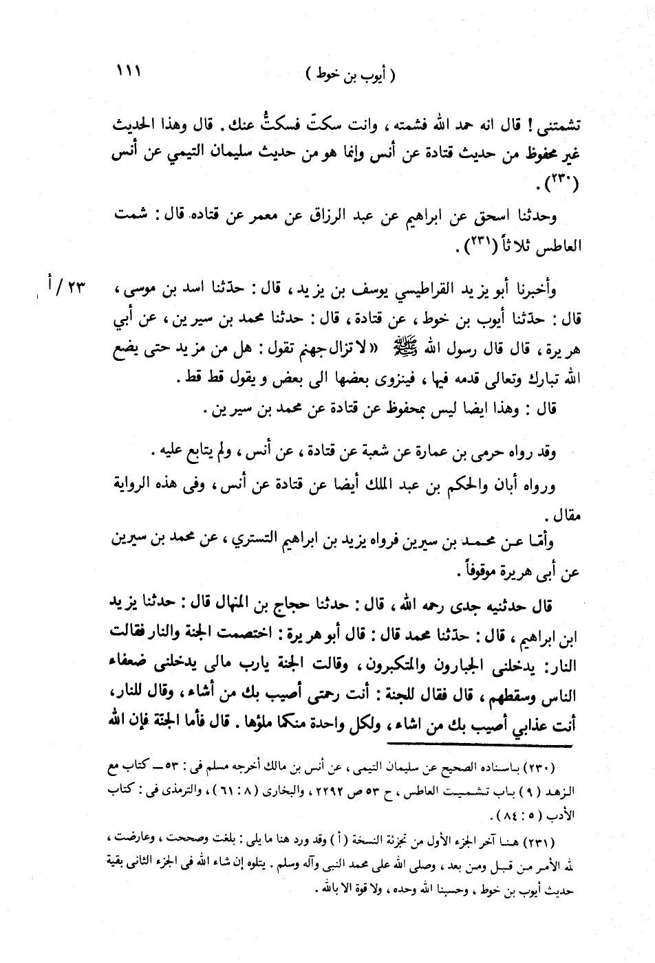 وَأَخْبَرَنَا أَبُو يَزِيدَ الْقَرَاطِيسِيُّ، يُوسُفُ بْنُ يَزِيدَ، قَالَ: حَدَّثَنَا أَسَدُ بْنُ مُوسَى قَالَ: حَدَّثَنَا أَيُّوبُ بْنُ خُوطٍ، عَنْ قَتَادَةَ، قَالَ: حَدَّثَنَا مُحَمَّدُ بْنُ سِيرِينَ، عَنْ أَبِي هُرَيْرَةَ قَالَ: قَالَ رَسُولُ اللَّهِ صَلَّى اللهُ عَلَيْهِ وَسَلَّمَ: §" لَا تَزَالُ جَهَنَّمُ تَقُولُ هَلْ مِنْ مَزِيدٍ حَتَّى يَضَعَ اللَّهُ تَبَارَكَ وَتَعَالَى قَدَمَهُ فِيهَا فَيَنْزَوِي بَعْضُهَا إِلَى بَعْضٍ، وَيَقُولُ: قَطْ قَطْ " قَالَ، وَهَذَا أَيْضًا لَيْسَ بِمَحْفُوظٍ عَنْ قَتَادَةَ، عَنْ مُحَمَّدِ بْنِ سِيرِينَ، وَقَدْ رَوَاهُ حَرَمِيُّ بْنُ عُمَارَةَ، عَنْ شُعْبَةَ، عَنْ قَتَادَةَ، عَنْ أَنَسٍ، وَلَمْ يُتَابَعُ عَلَيْهِ، وَرَوَاهُ أَبَانُ، وَالْحَكَمُ بْنُ عَبْدِ الْمَلِكِ أَيْضًا، عَنْ قَتَادَةَ، عَنْ أَنَسٍ، وَفَى هَذِهِ الرِّوَايَةِ مَقَالٌ، وَأَمَّا عَنْ مُحَمَّدِ بْنِ سِيرِينَ، فَرَوَاهُ يَزِيدُ بْنُ إِبْرَاهِيمَ التُّسْتَرِيُّ، عَنْ مُحَمَّدِ بْنِ سِيرِينَ، عَنْ أَبِي هُرَيْرَةَ مَوْقُوفًا