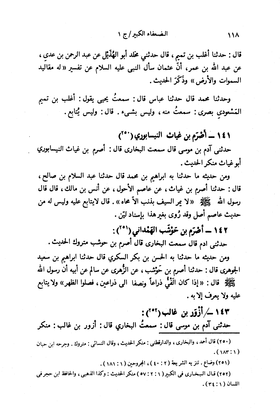 §143 - أَزْوَرُ بْنُ غَالِبٍ حَدَّثَنِي آدَمُ بْنُ مُوسَى قَالَ: سَمِعْتُ الْبُخَارِيَّ قَالَ: أَزْوَرُ بْنُ غَالِبٍ مُنْكَرُ الْحَدِيثِ