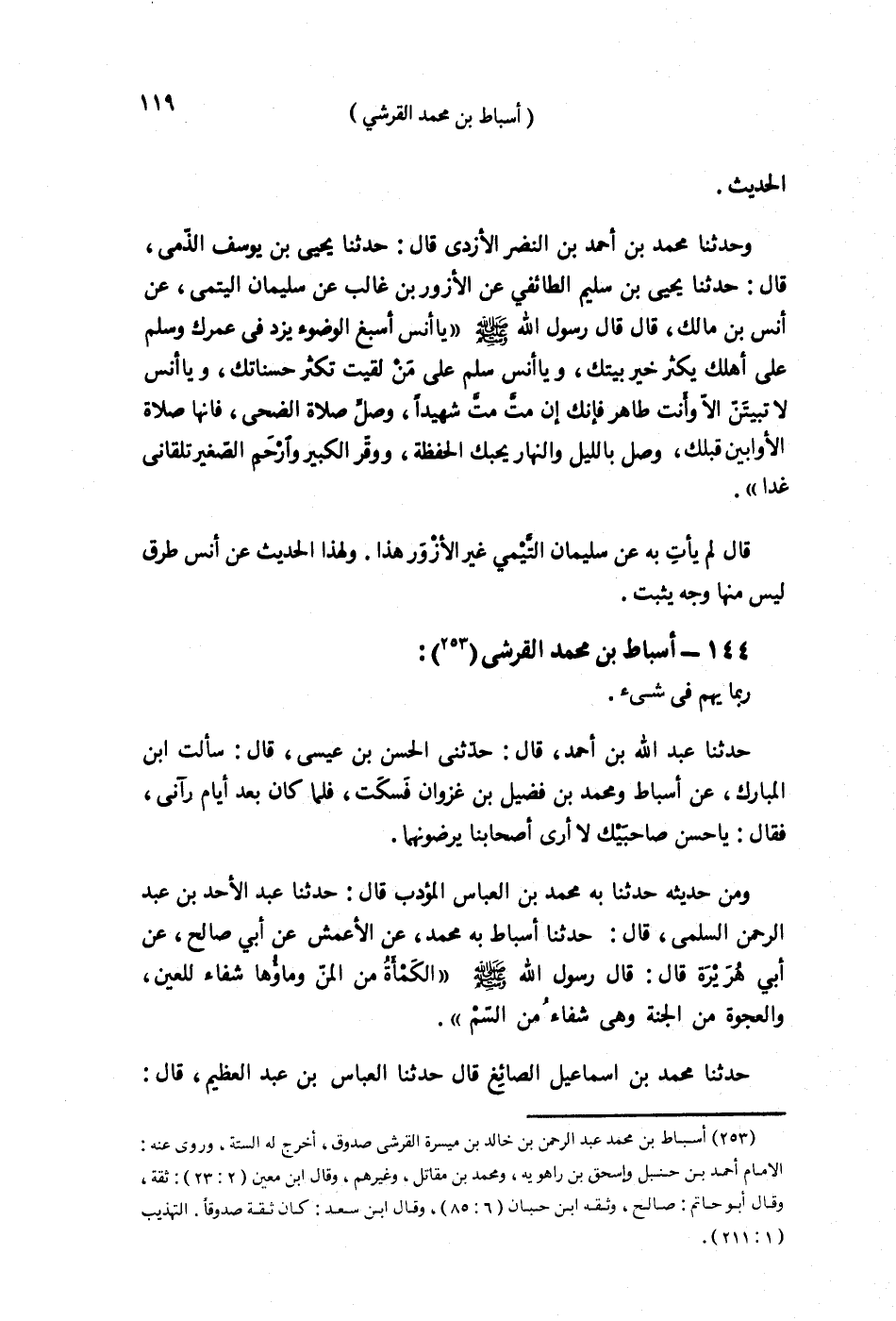 §144 - أَسْبَاطُ بْنُ مُحَمَّدٍ الْقُرَشِيُّ رُبَّمَا يَهِمُ فِي شَيْءٍ حَدَّثَنَا عَبْدُ اللَّهِ بْنُ أَحْمَدَ قَالَ: حَدَّثَنِي الْحَسَنُ بْنُ عِيسَى قَالَ: سَأَلْتُ ابْنَ الْمُبَارَكِ عَنْ أَسْبَاطٍ وَمُحَمَّدِ بْنِ فُضَيْلِ بْنِ غَزْوَانَ فَسَكَتَ، فَلَمَّا كَانَ بَعْدَ أَيَّامٍ رَآنِي، فَقَالَ: يَا حَسَنُ صَاحِبَيْكَ لَا أَرَى أَصْحَابَنَا يَرْضَوْنَهُمَا